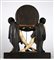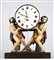 MANIFATTURA VENETA DEL XVII SECOLO Orologio da tavolo con quadrante in porcellana sorretto da due figure maschili in legno scolpito e dipinto in policromia. . Cm 37,00 x 44,00 x 21,00.