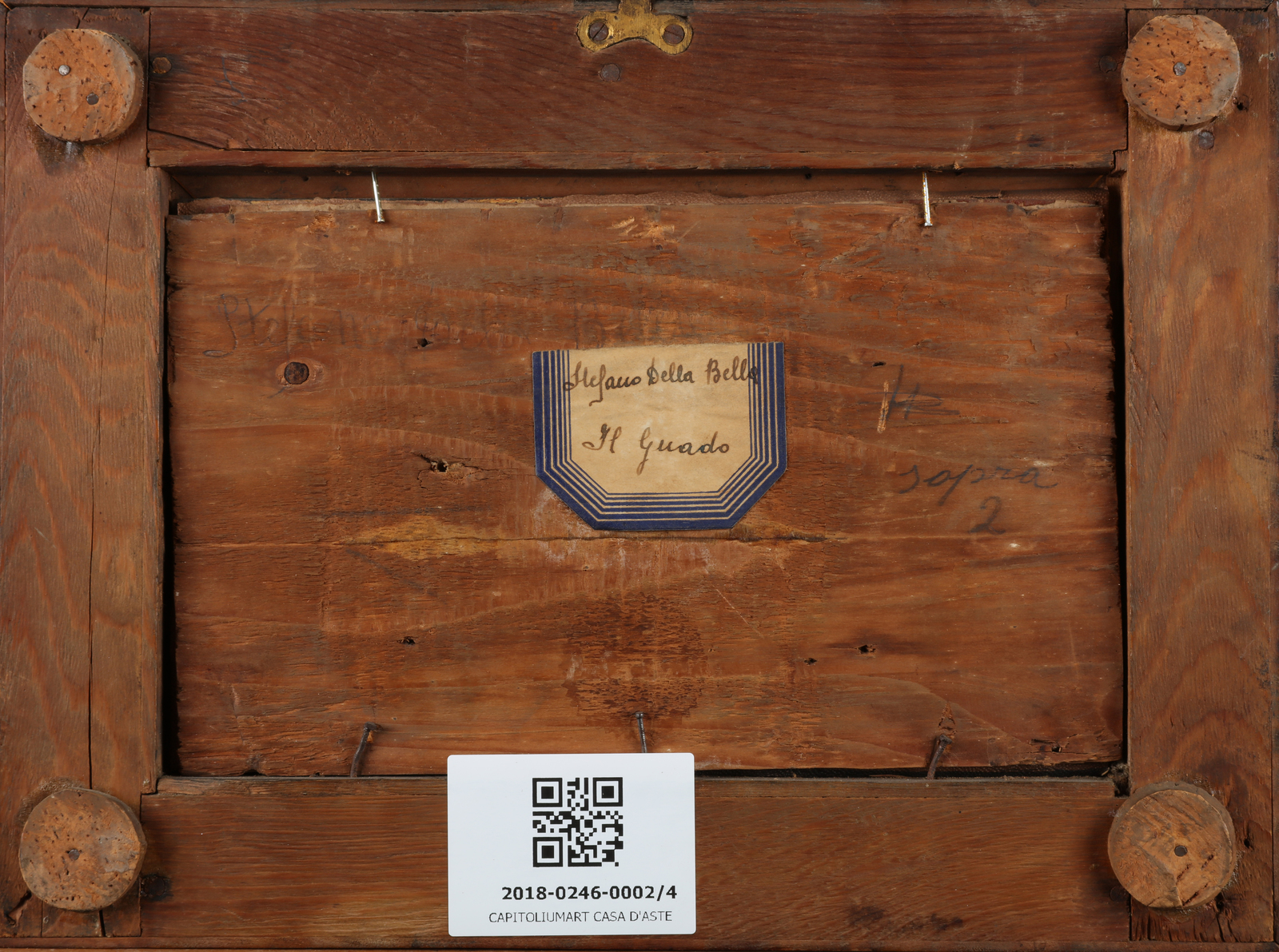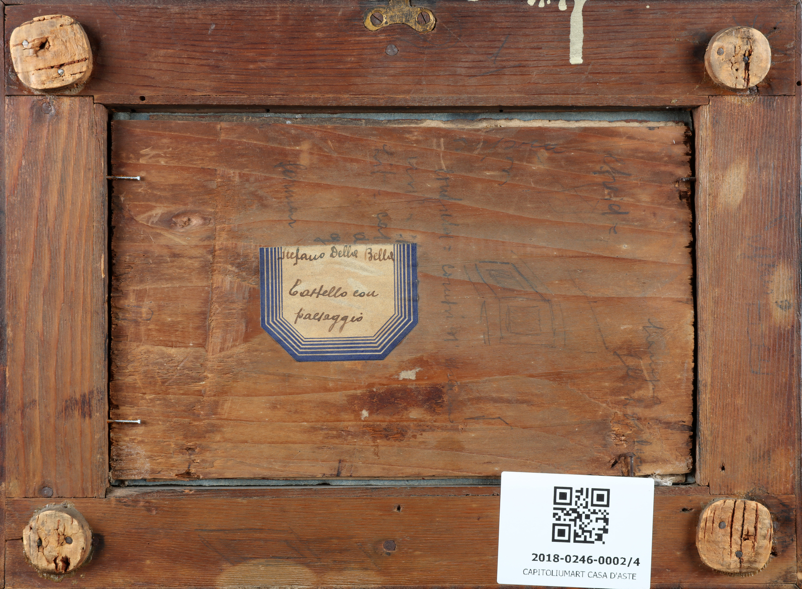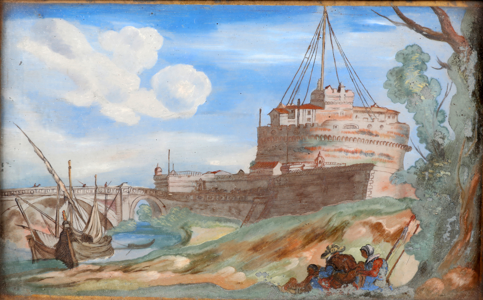 ARTISTA ITALIANO DEL XIX SECOLO Lotto composto da quattro opere raffiguranti Castello con paesaggio. Castello Sant' Angelo. Il guado. Il trasporto del cannone. Olio su vetro. Cm 20,00 x 12,50. Al retro cartiglio con titolo e firma Stefano della Bella. Difetti. Cornice presente