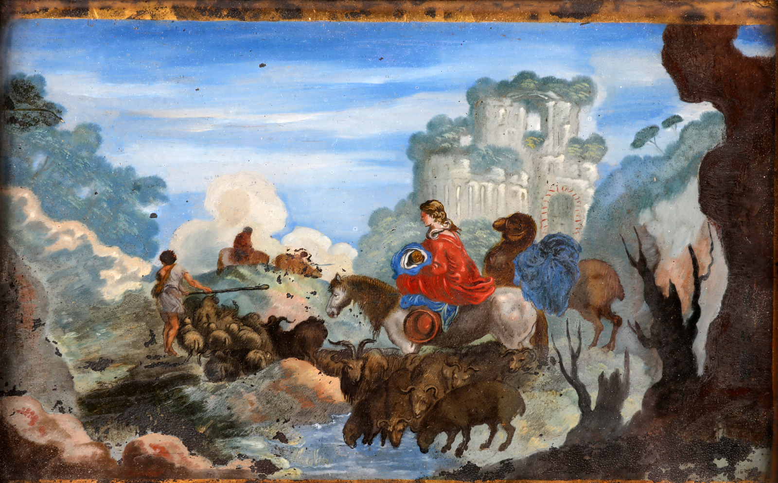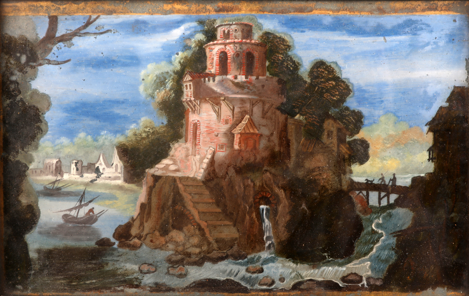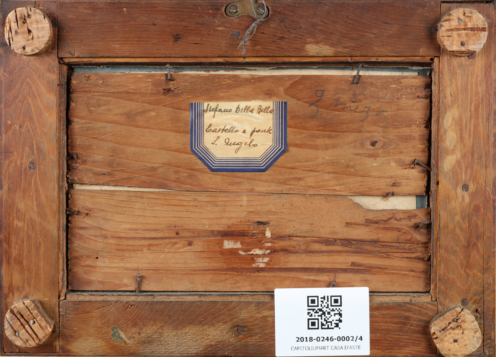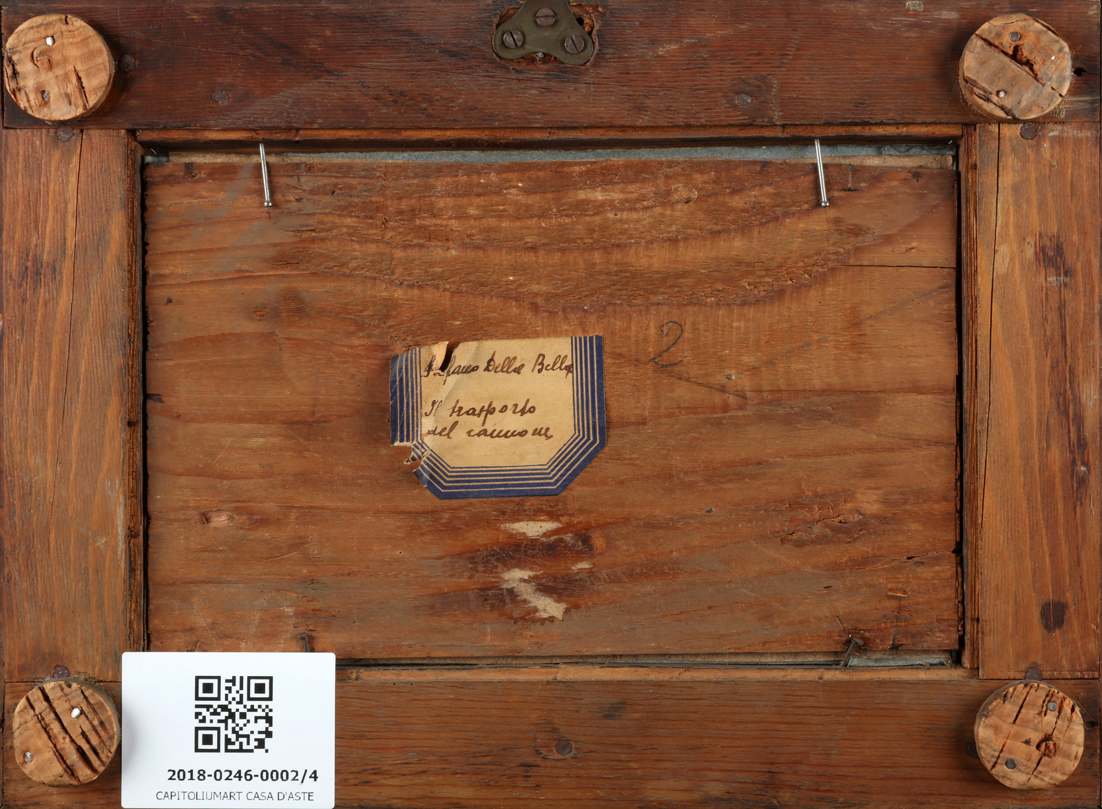ARTISTA ITALIANO DEL XIX SECOLO Lotto composto da quattro opere raffiguranti Castello con paesaggio. Castello Sant' Angelo. Il guado. Il trasporto del cannone. Olio su vetro. Cm 20,00 x 12,50. Al retro cartiglio con titolo e firma Stefano della Bella. Difetti. Cornice presente