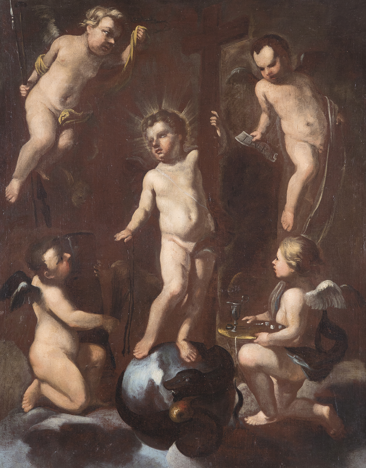 ARTISTA DEL XVII SECOLO Il Bambin Gesù sul globo terrestre circondato dalle quattro Virtù Cardinali. Olio su tela . Cm 72,00 x 91,00.
