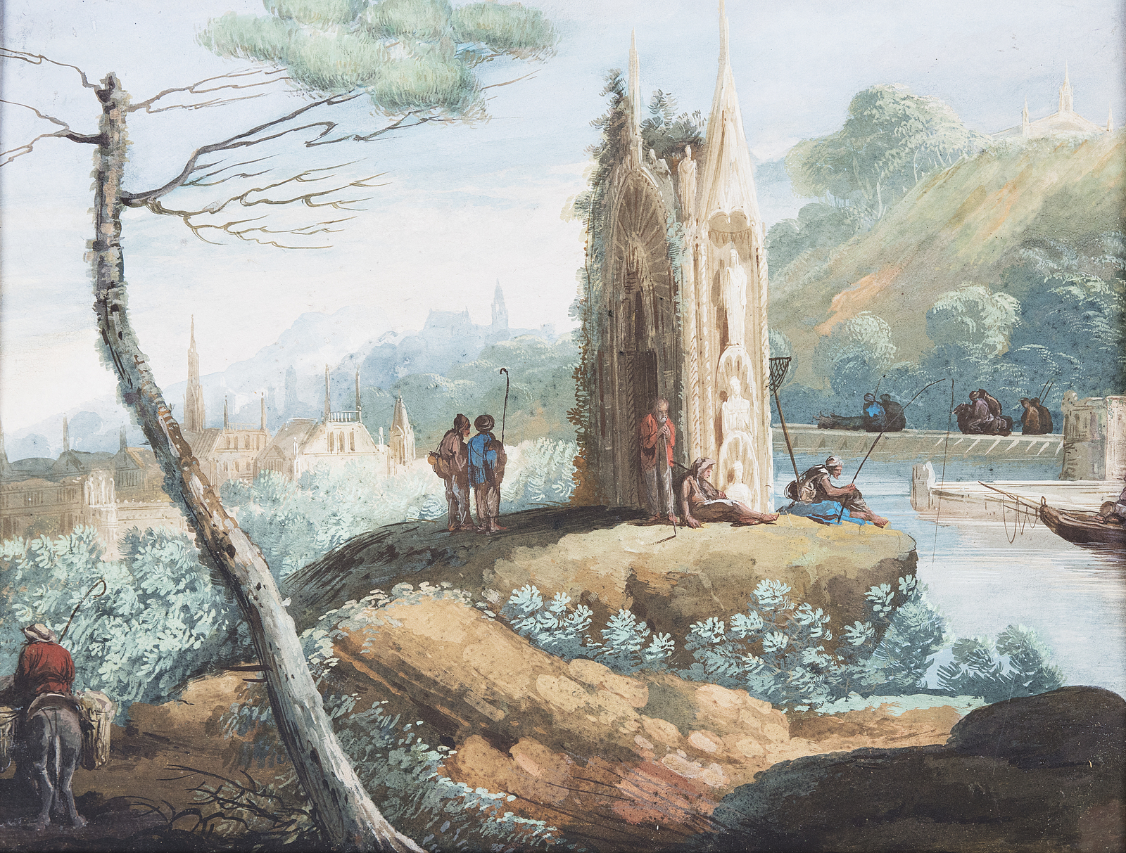 BISON GIUSEPPE BERNARDINO (1762 - 1844) Attribuito a. Paesaggio di fantasia con pescatori e viandanti. Tempera su carta. Cm 54,00 x 41,00. . Cornice presente