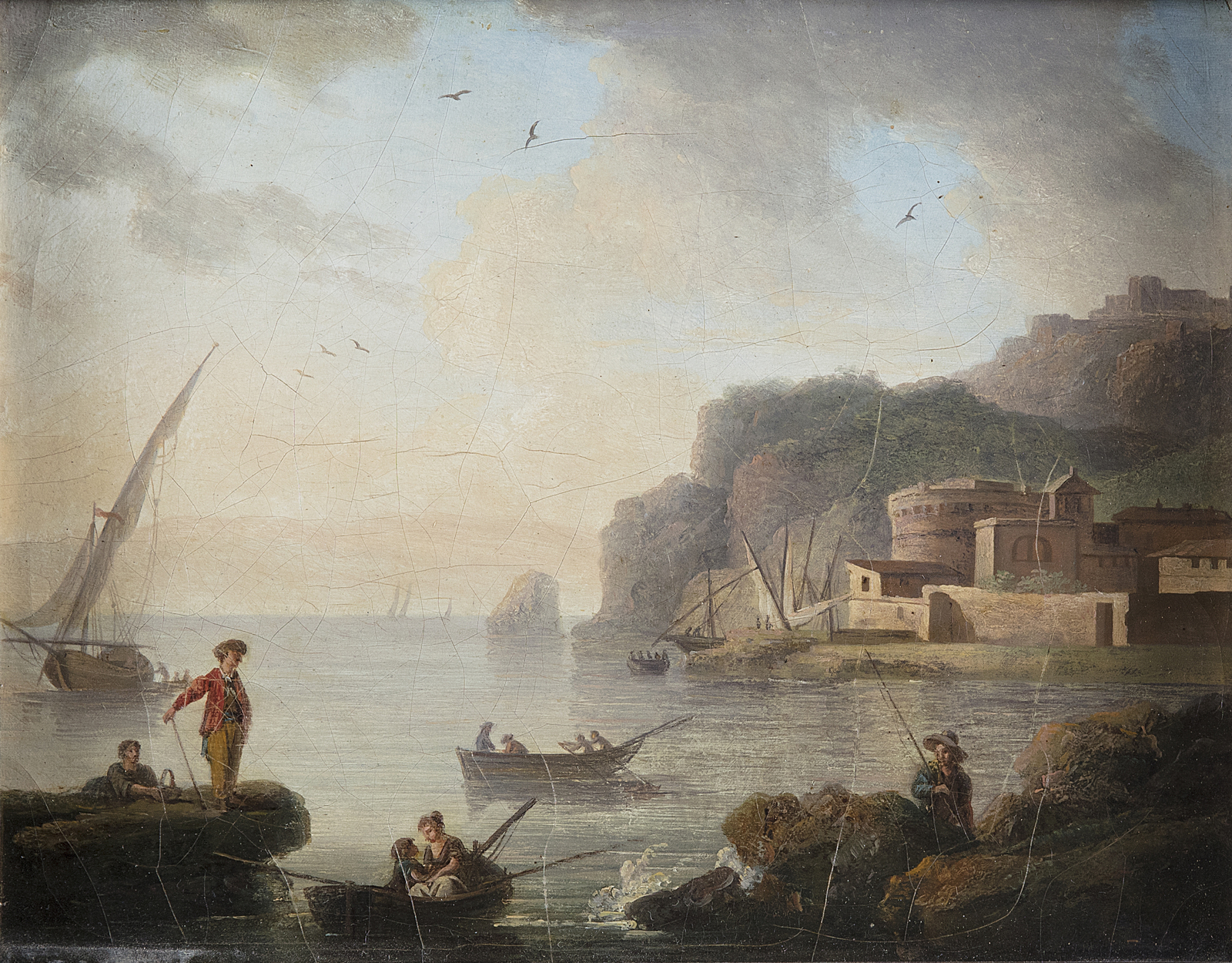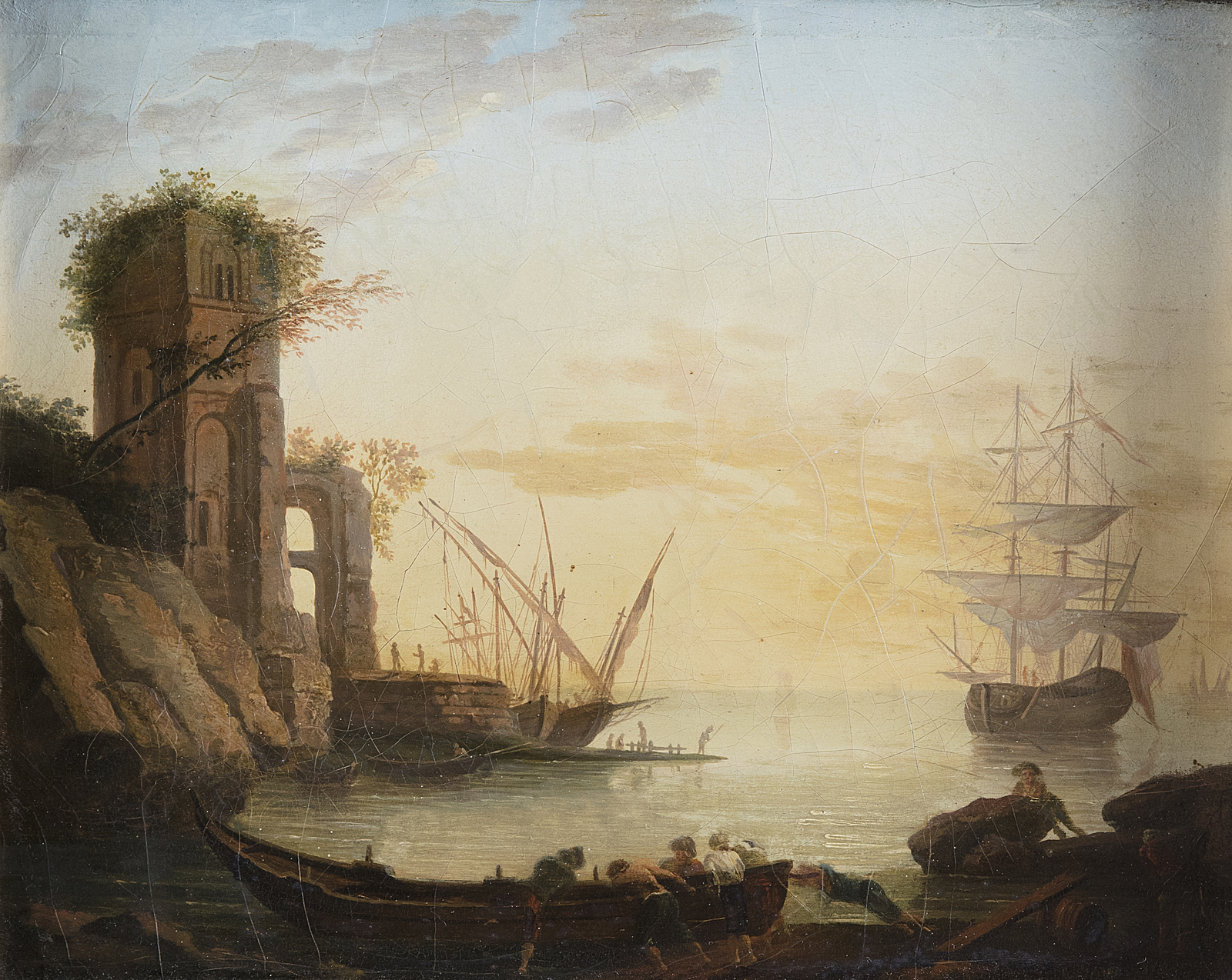 LACROIX DE MARSEILLE CHARLES FRANCOIS (1700 - 1782) Attribuito a. Coppia di marine con personaggi. Olio su tela . Cm 24,00 x 19,00. . Cornice presente