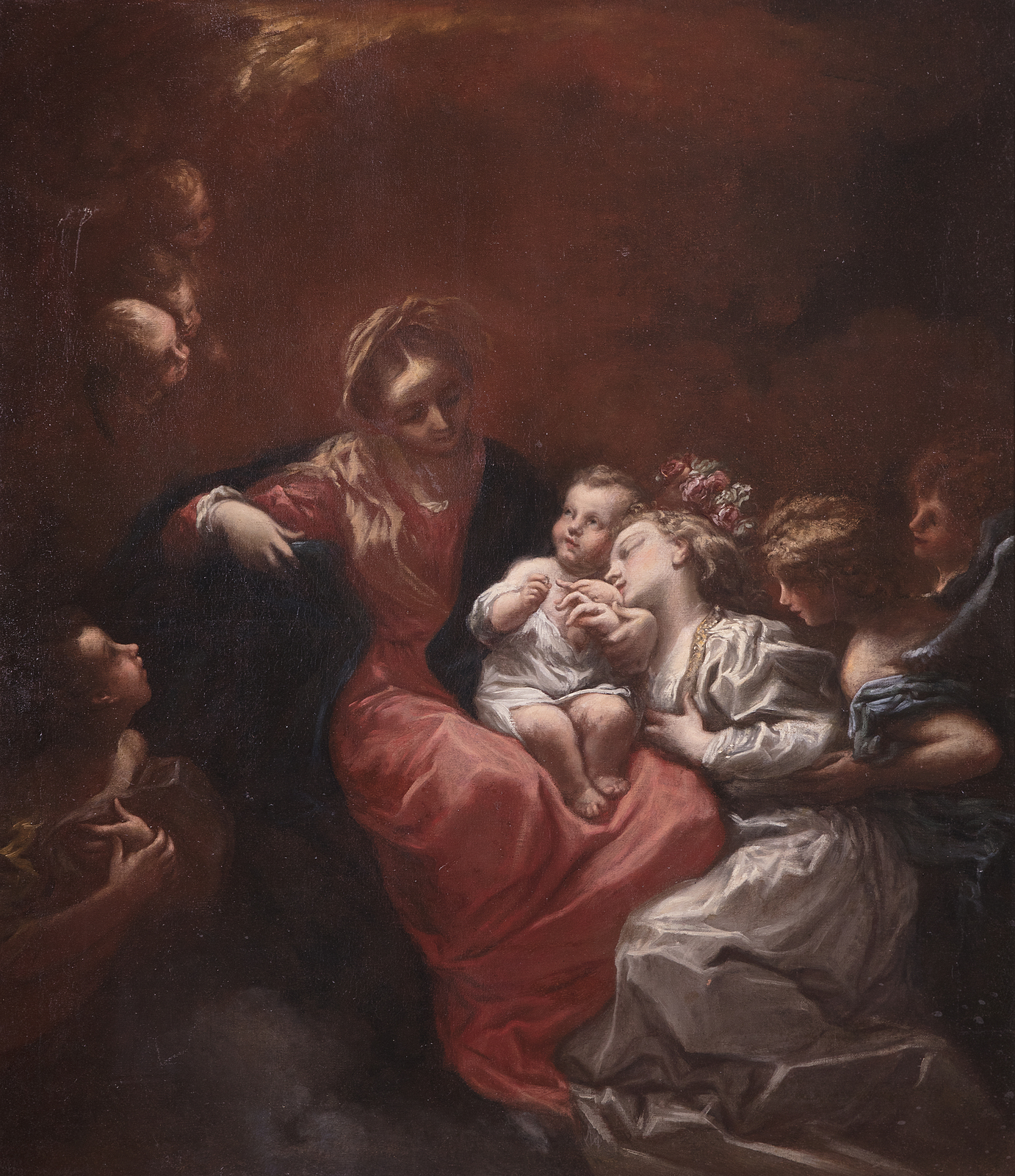 MEHUS LIVIO (1630 - 1691) Matrimonio mistico di Santa Caterina. Olio su tela . Cm 85,00 x 97,50. Bibliografia: Sandro Bellesi, Pittura e scultura a Firenze (secoli XVI-XIX secolo), Firenze, 2017, p.95. Cornice presente