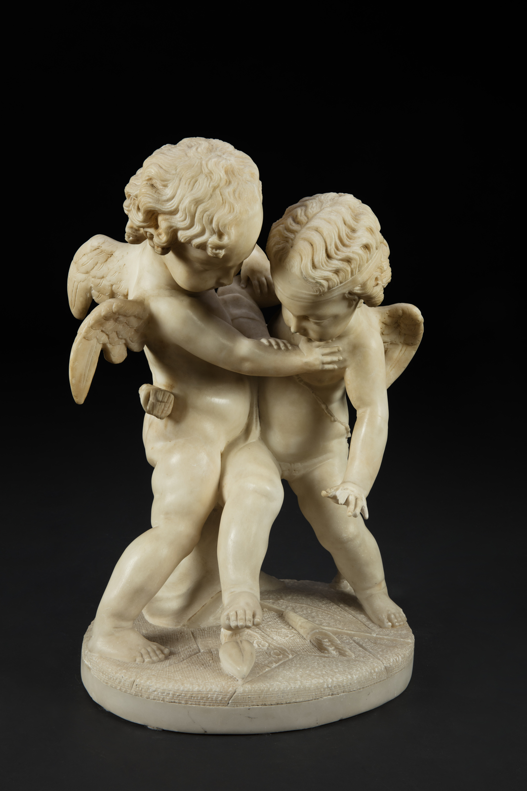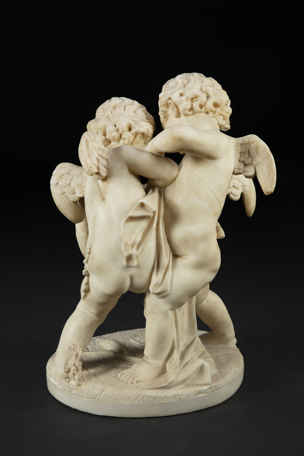 MANIFATTURA ITALIANA DEL XIX SECOLO Coppia di amorini danzanti. Marmo. Cm 27,00 x 45,00 x 24,00. Il modello è ripreso da un'opera di Antonio Canova (cfr. G. Pavanello, L'opera completa di Antonio Canova, Milano 1976, p. 241). Per un esemplare simile si veda Asta Koller, Zurigo, 3 dicembre 2008, lotto n 1295.