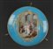 MANIFATTURA FRANCESE DEL XIX SECOLO Piatto in porcellana dipinta a fondo turchese con scena di matrimonio in riserva rettangolare bordata in oro, entro struttura in bronzo dorato, XIX secolo. . Cm 28,50 x 28,50.