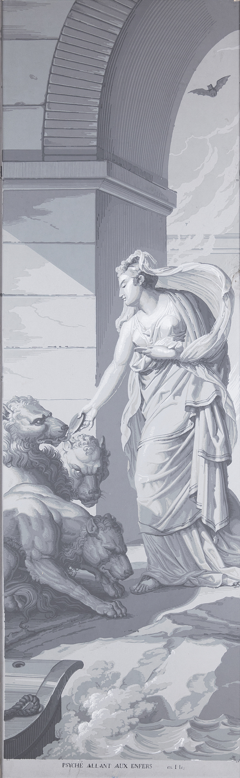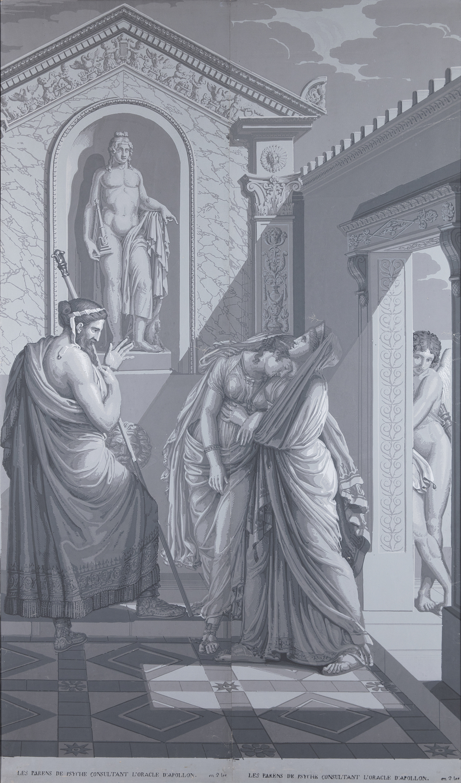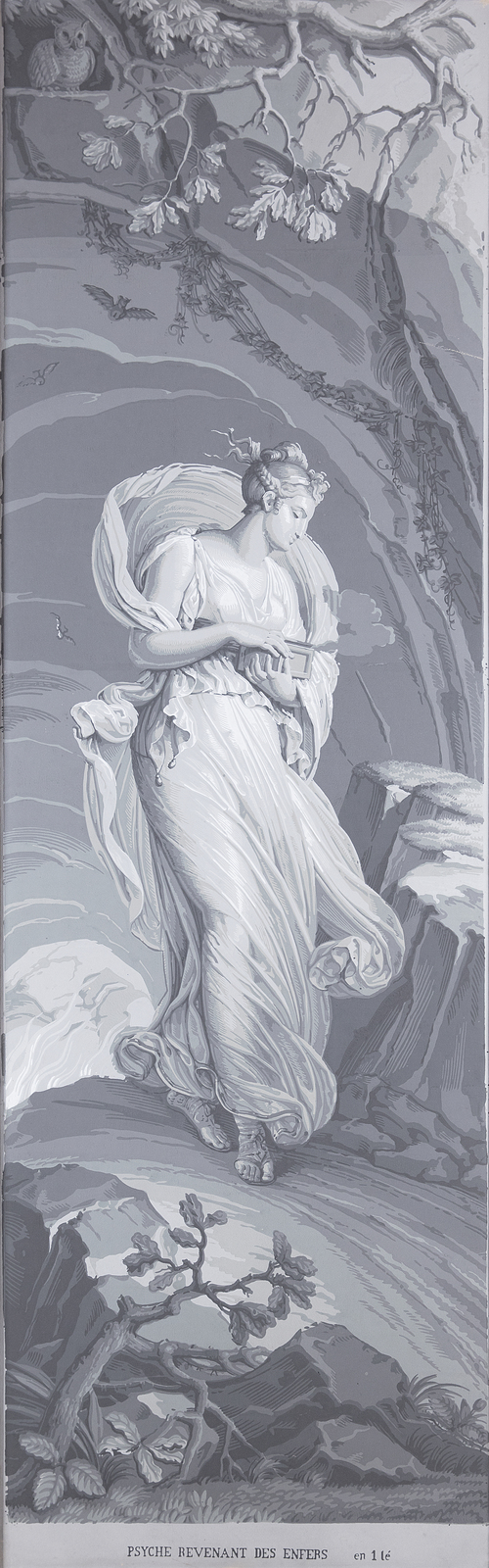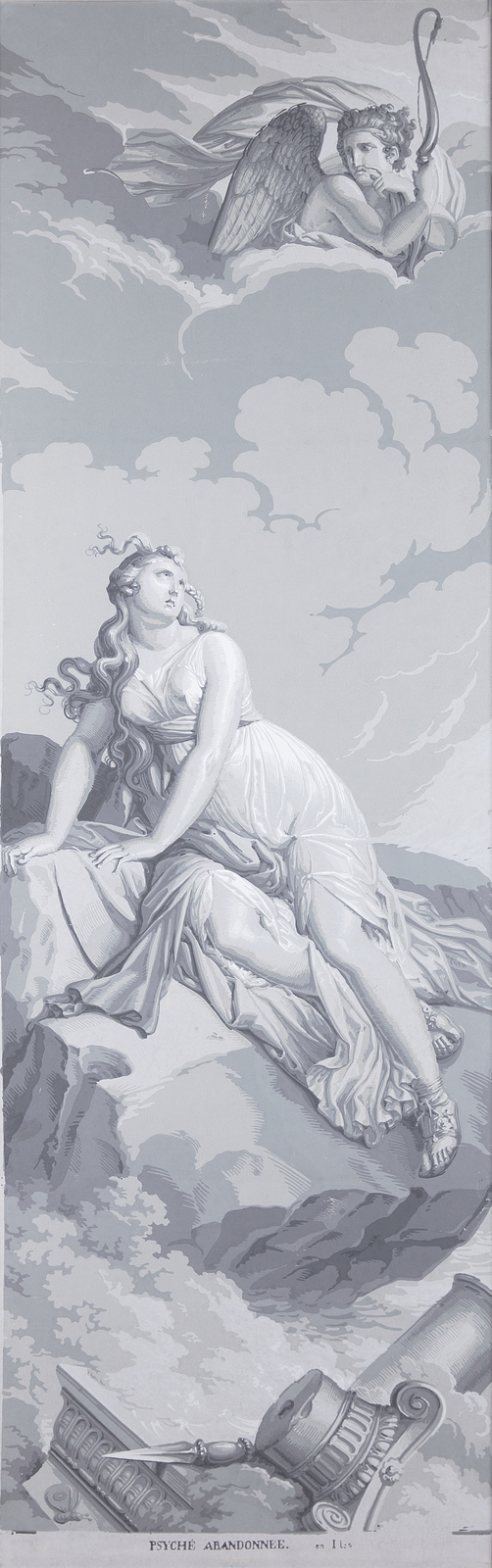 MANIFATTURA JOSEPH DUFOUR (1754-1827) Gli amori di Psiche e Amore. Serie completa. . Cm 164,50 x 185,50. Si tratta di dodici scene costituite da ventisei fogli dipinti all'acquarello su carta riportati su tela. Le scene n. 4 e n. 5 sono state ridotte e i ritagli inseriti nella presente vendita. Da sinistra: 1- I genitori di Psiche consultano l'oracolo di Apollo; 2- Psiche trasportata da Zefiro; 3- Il bagno di Psiche; 4- Psiche mostra i gioielli alle sorelle; 5- Psiche tenta di pugnalare Amore addormentato; 6- Psiche abbandonata; 7- Psiche salvata da un pescatore; 8- Psiche porta a Venere il vaso con l'acqua della Giovinezza; 9- Psiche va agli inferi; 10- Psiche torna dagli inferi; 11- Riconciliazione di Venere e Psiche; 12- Psiche e Amore. Difetti. La manifattura di Joseph Dufour prende il nome dal suo creatore che la fondò nel 1797 a Macon. In seguito al grande successo riscontrato dalla serie "I selvaggi del Pacifico" nell'esposizione del 1806 (Exposition des produits de l'industrie francaise) i papier peints Dufour iniziarono a riscontrare interesse in Francia e all'estero. La serie di Psiche e Amore, inspirata dal libro di Jean de la Fontaine "Gli amori di Pische e Amore", fu presentata nel 1819 e venne considerata come il suo capolavoro. le scene sono tratte da disegni di Louis Lafitte, Merry Joseph Blondel e Gérard. 185 x 108.5 cm e 183 x 55,5 cm. Bibliografia di riferimento: Odile Nouvel-Kammerer, Papiers Peints panoramiques, Musée des Art Decoratifs, Flammarion, Paris 1990, pp 262,263. Cornice presente