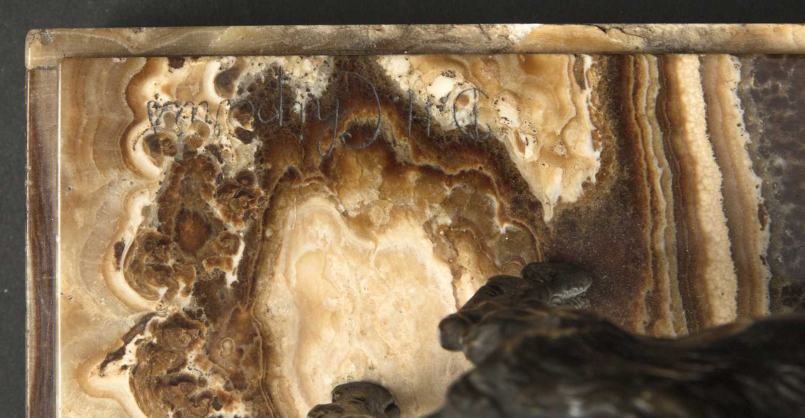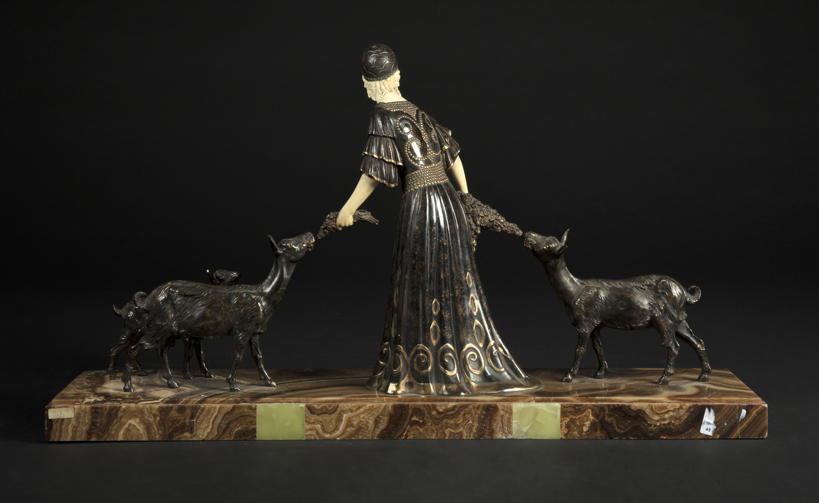 CHIPARUS DIMITRI (1886 - 1947) Scultura in bronzo e avorio raffigurante una figura femminile con caprette. . . Cm 85,00 x 50,00 x 18,00. Base lastronata in onice. Firmato. Difetto a una delle caprette.