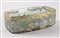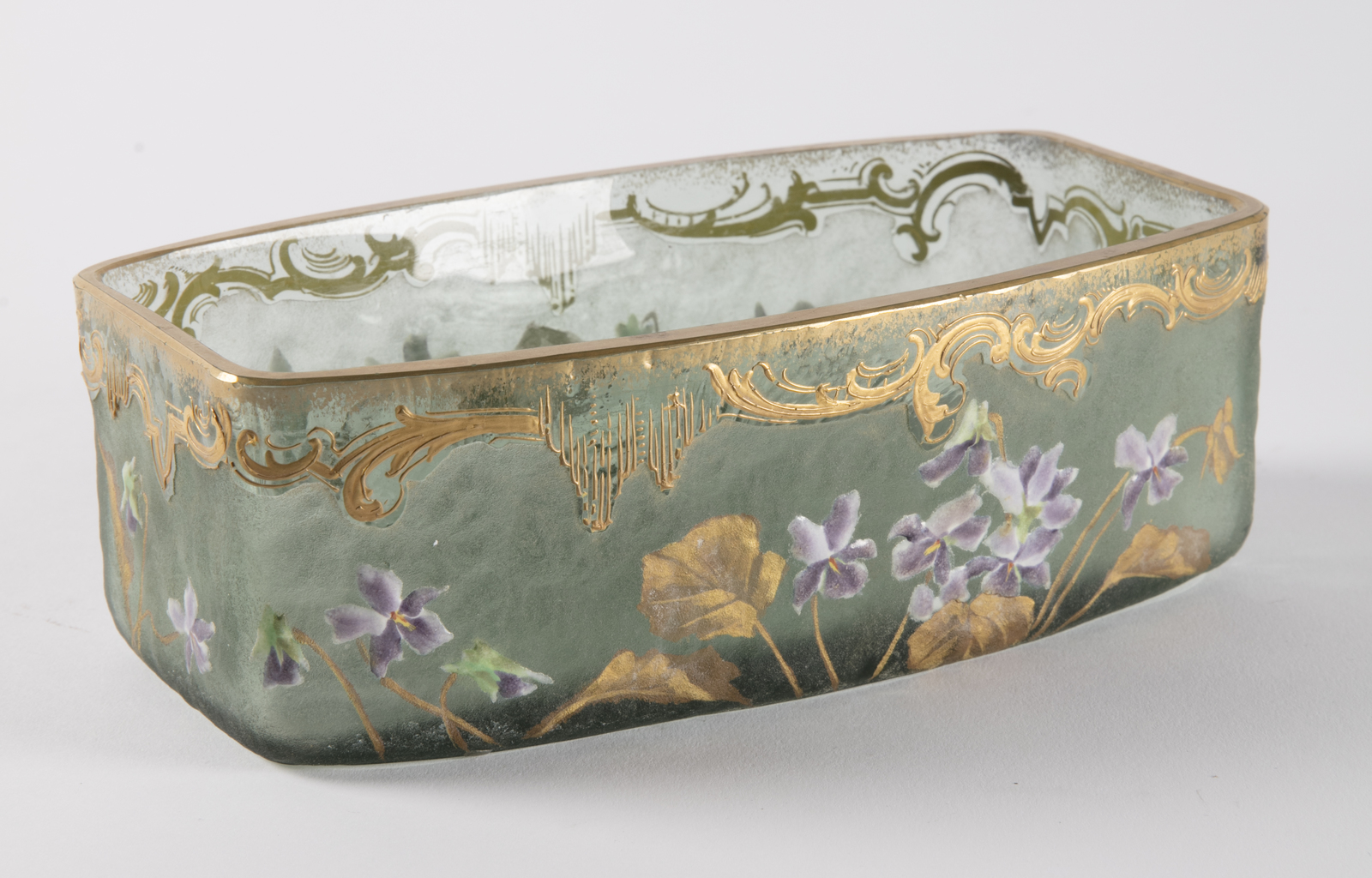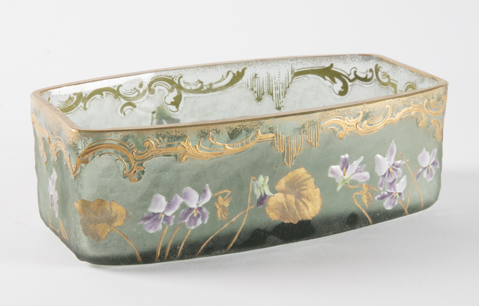 MONT - JOYE LEGRAS Jardiniere di forma rettangolare in vetro doppio, decoro di tralci di violette nei toni naturali adornate da foglie ad oro finemente inciso ad acido, ripreso con pittura a smalti policromi su fondo givrè verde acqua. Elegante ornatura a rocailles, al bordo superiore in rilievo ad oro zecchino. . . Cm 19,00 x 6,50 x 11,00. Firma a cachet dorèt, con figura del Vescovo con la mitra " Mont - Joye/ L.C. ", epoca 1926. Autentica su fotografia di Franco Borga.