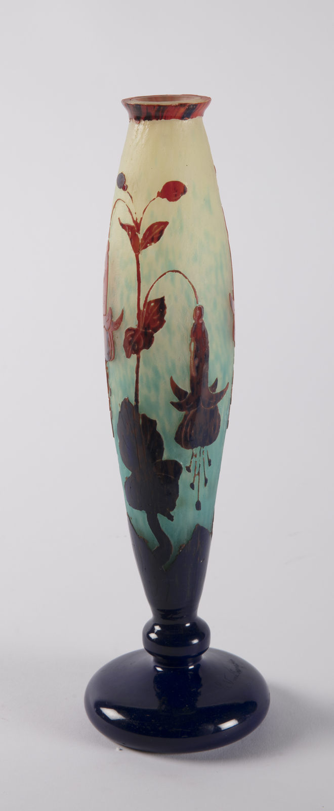 LE VERRE FRANCAIS Vaso a balaustro riposante su base circolare in vetro triplo, decoro di fucsie e foglie nei toni del rosso vermiglione sfumato e blu cobalto, finemente inciso ad acido su fondo maculato giallo canarino sfumato verde smeraldo. . . Cm 30,00. Firma incisa alla moletta " Le Verre Francais" . Epoca 1924 - 1927. Esemplare simile " Dictionnaire Des Maitres Verriers" di Philippe Olland, Ed. Faton, pag. 292. Autentica su fotografia di Franco Borga.