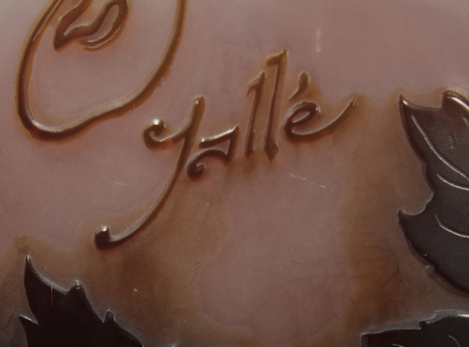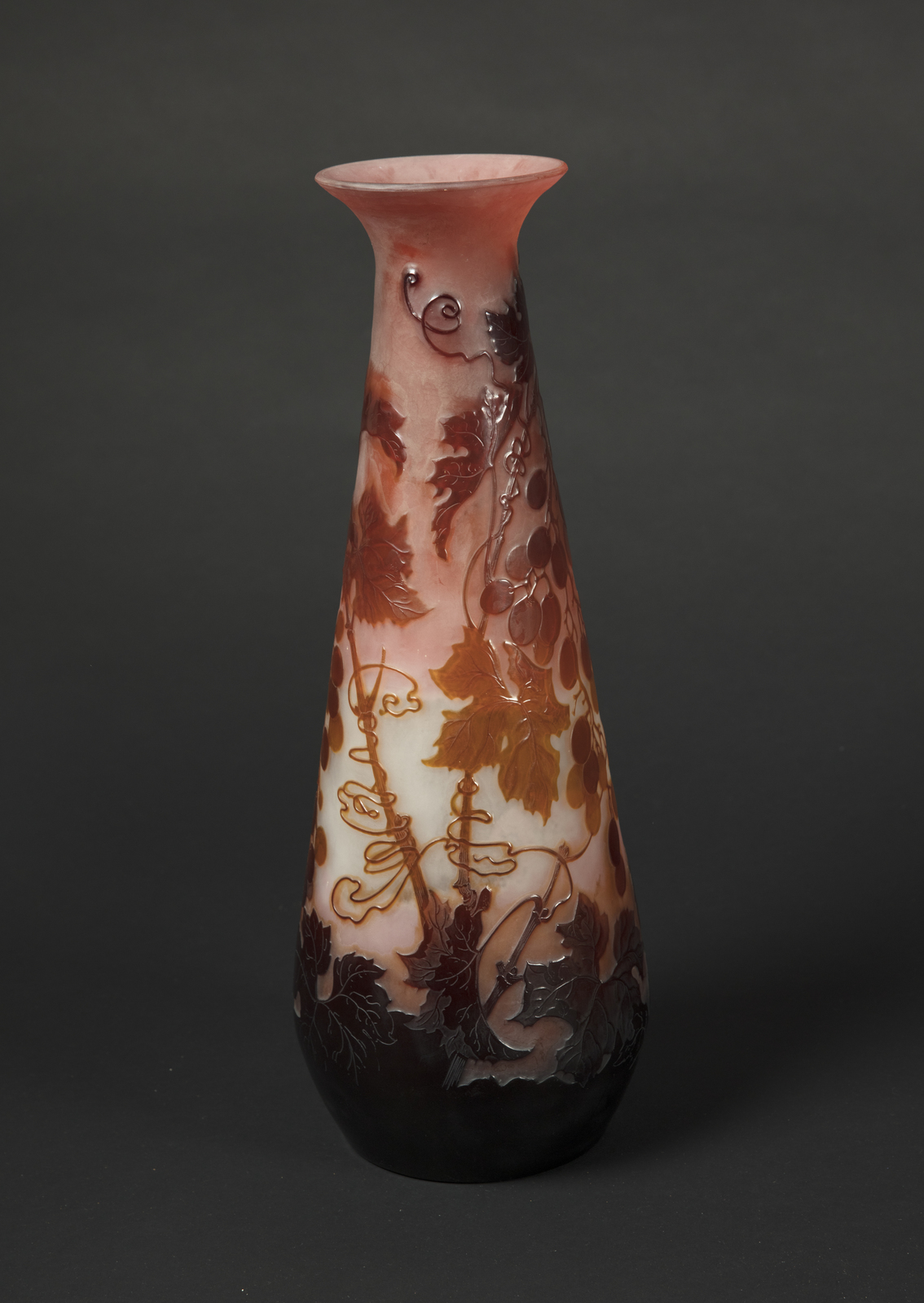 GALLE' Grande vaso ovoidale in vetro doppio, decoro di uva e foglie nei toni del caramello e tabacco, finemente inciso ad acido. . Pasta di vetro. Cm 45,50. Firma in rilievo a cammeo " Gallè ". Epoca 1910. Parere verbale di Franco Borga.