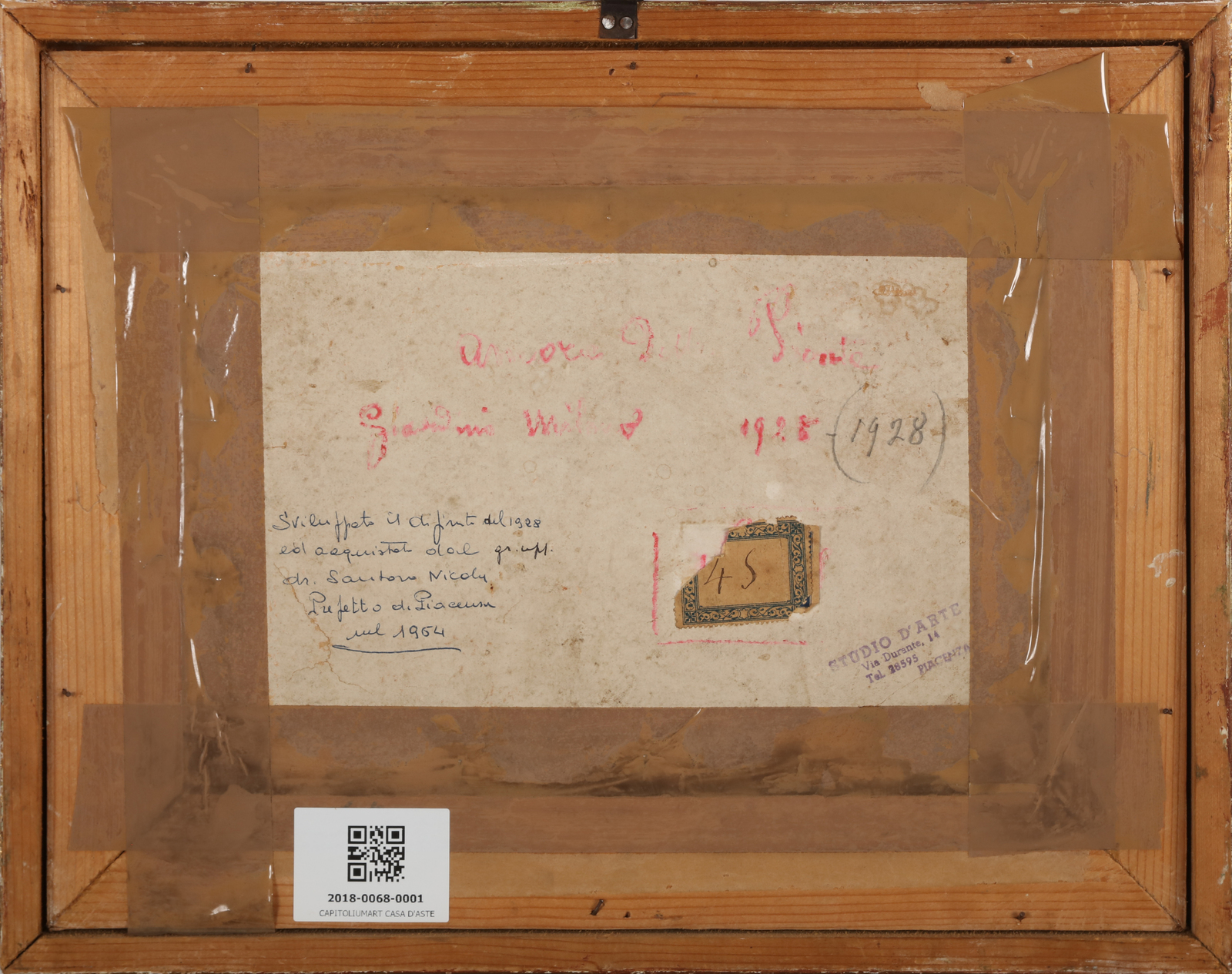 SIDOLI PACIFICO (1868 - 1963) Studio per alberi. 1928. Olio su cartone pressato. Cm 29,00 x 20,00. Firma in basso a sinistra. Al retro riporta data 1928. Al retro timbro Studio D'Arte Piacenza. . Cornice presente