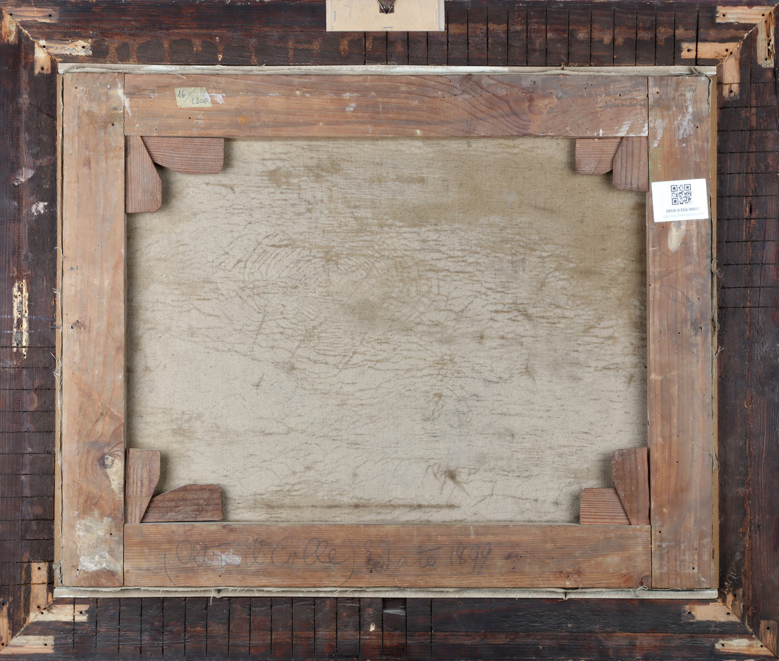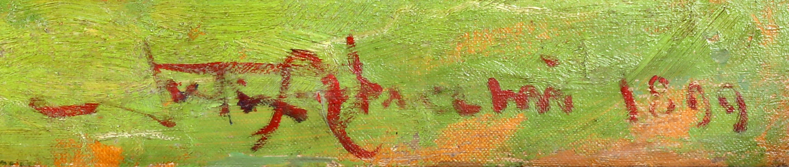 ABRAMI FELICE (1872 - 1919) Paesaggio montano con case. 1899. Olio su tela . Cm 63,50 x 50,00. Firmato e datato in basso a destra e datato. Cornice presente