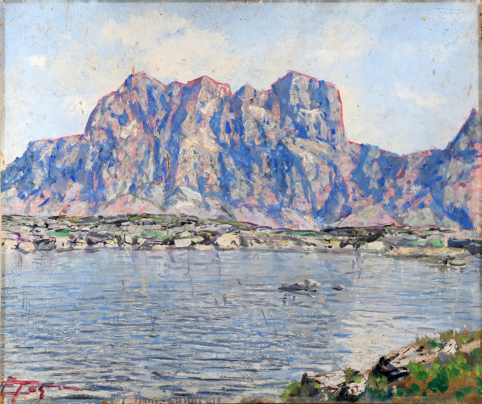 TOGNI EDOARDO (1884 - 1962) Il Blumone e il suo lago. Olio su tavola. Cm 60,00 x 50,00. Firmato in basso a sinistra. Al retro titolo. Cornice presente