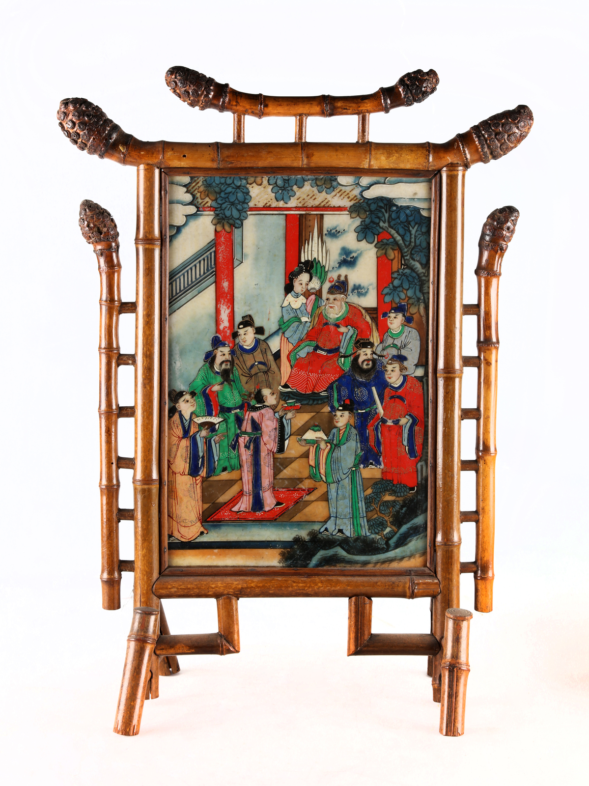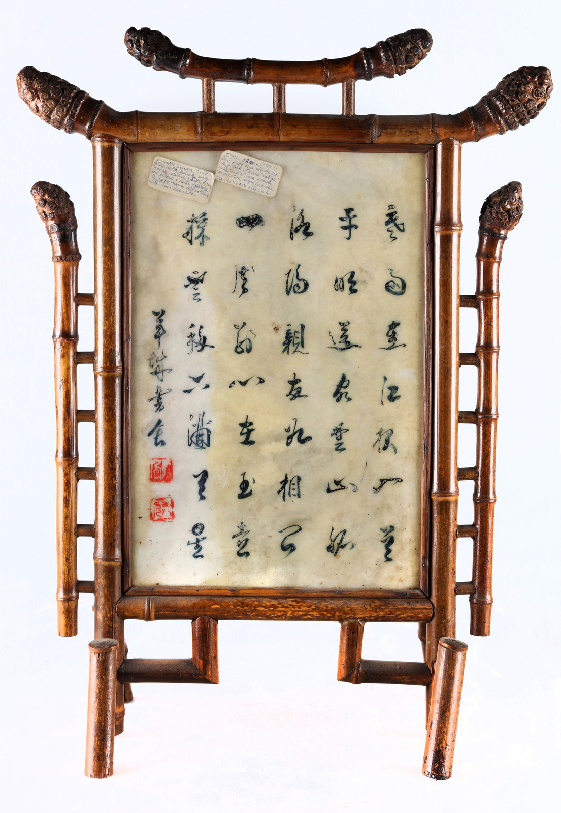 Arte Cinese Schermo da tavolo in porcellana raffigurante scena cortese entro cornice in bamboo Cina, XIX secolo . . Cm 24,00 x 36,00. Il retro reca lunga iscrizione con sigillo dell'artista ed etichette di una vecchia collezione. Cornice presente