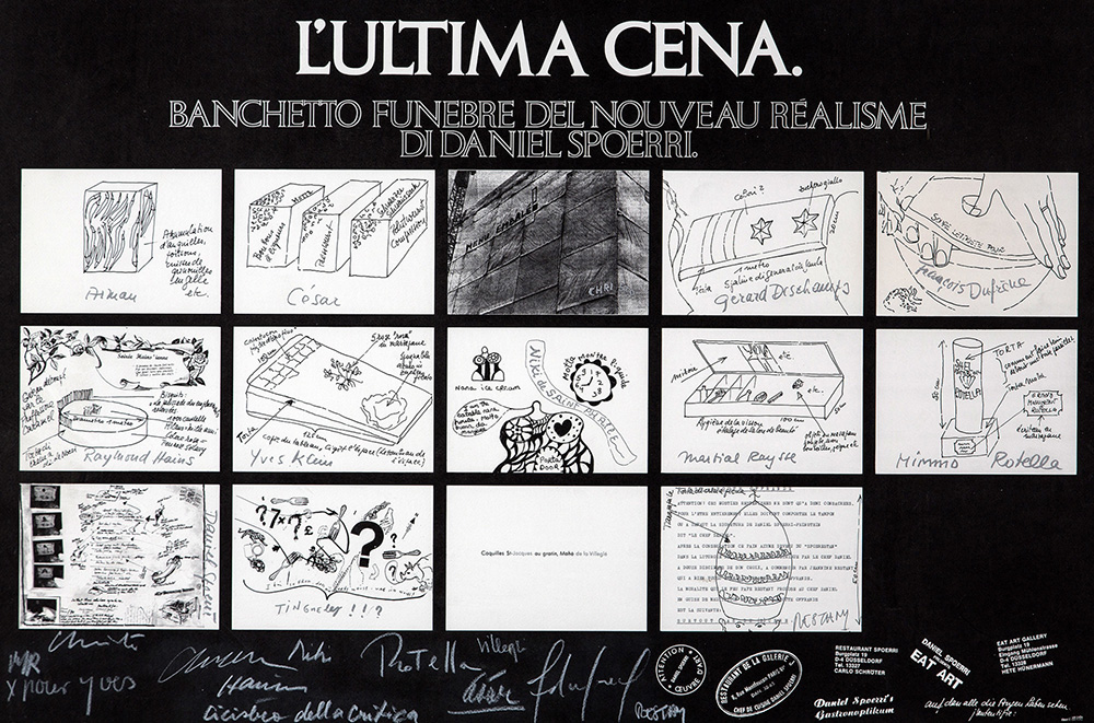 DANIEL SPOERRI 1930 La ultima cena, banchetto funebre del Nouveau Realisme di Daniel Spoerri, 1970 Serigrafia su carta con firme autografe degli esponenti del Nouveau Realisme, cm. 69 x 98 cm Firmato in basso a destra Opera n. 79/100 Prov. Collezione Privata