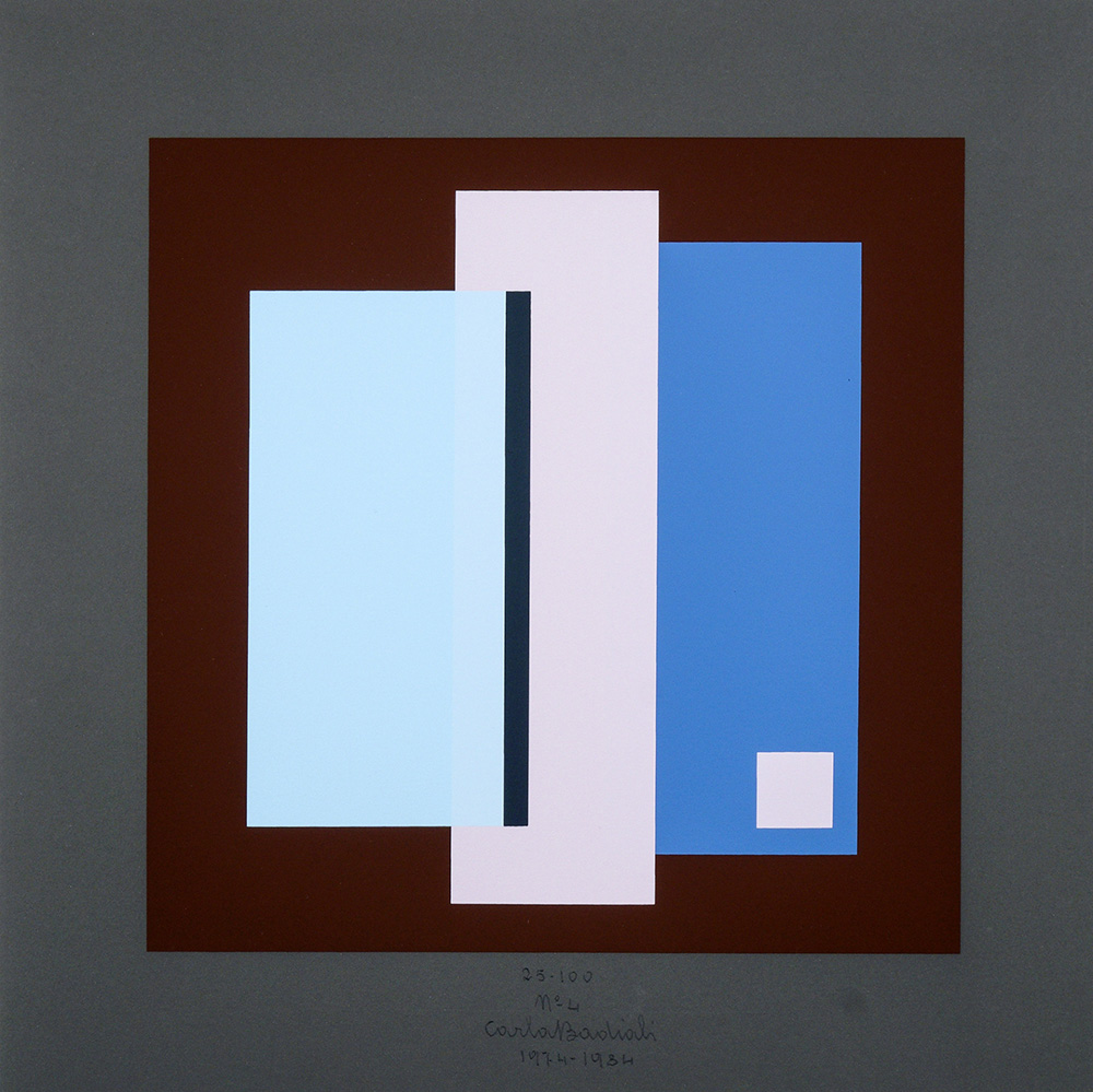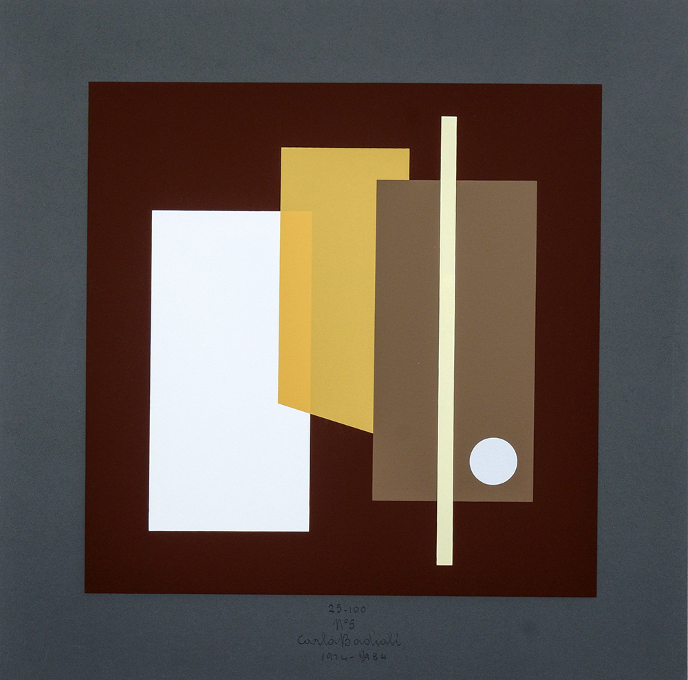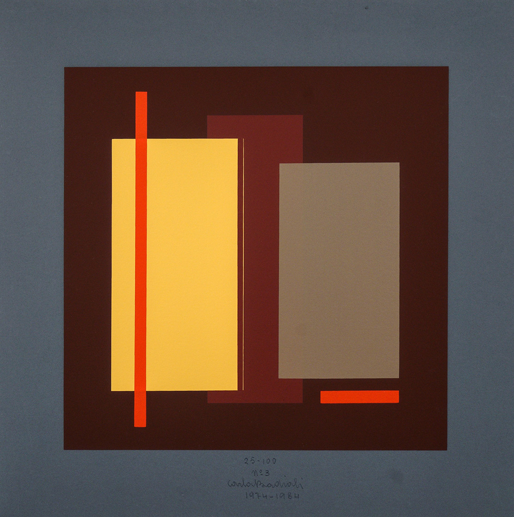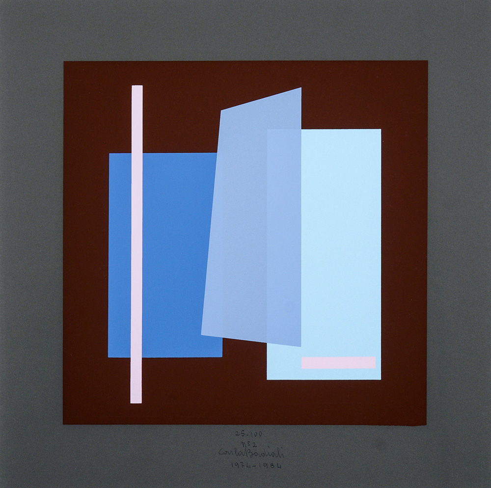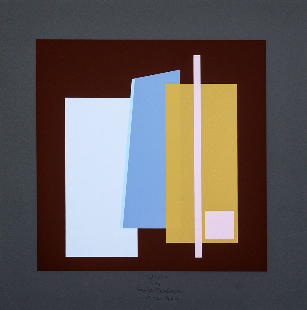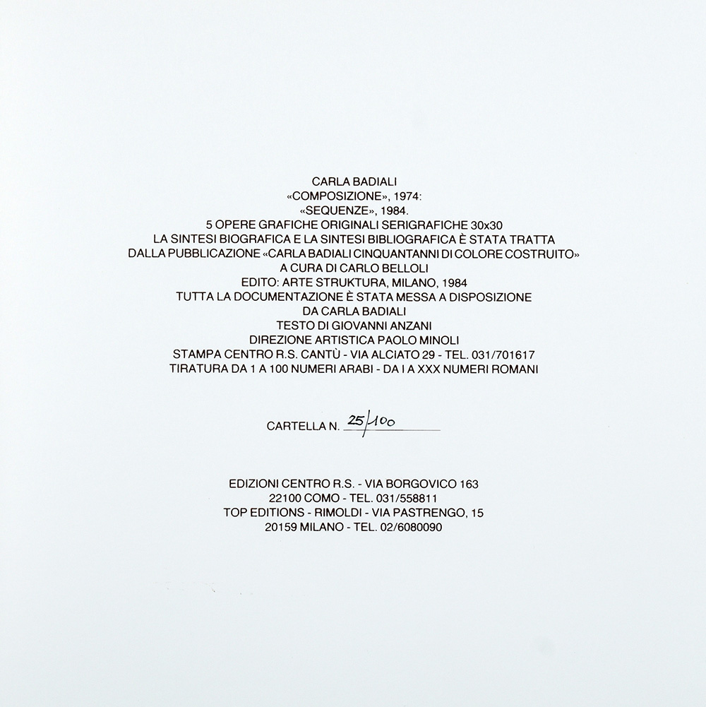CARLA BADIALI 1907 - 1992 “Composizione”, 1974: “Sequenze”, 1984., 1985 Cartella contenente 5 grafiche serigrafia, cm. 30 x 30 cad. Edizioni Centro R.S. Como Top Editions - Rimoldi Milano Tiratura 1 - 100 numeri arabi - Da I a XXX numeri romani Firmato e datato in basso al centro Opera n. 25/100 Prov. Collezione Privata