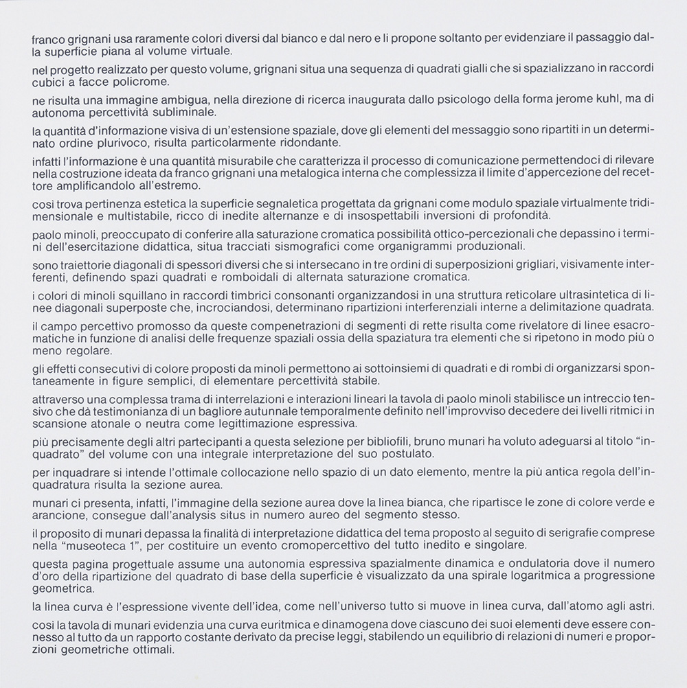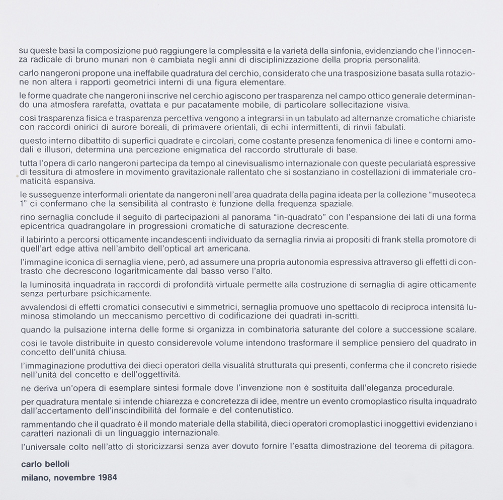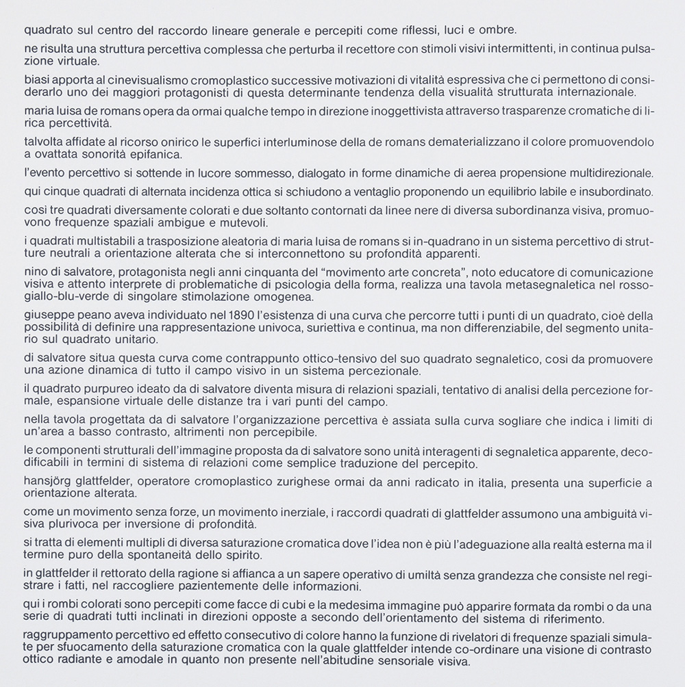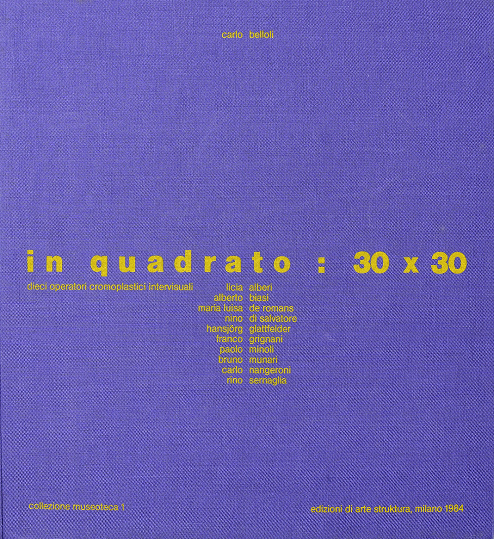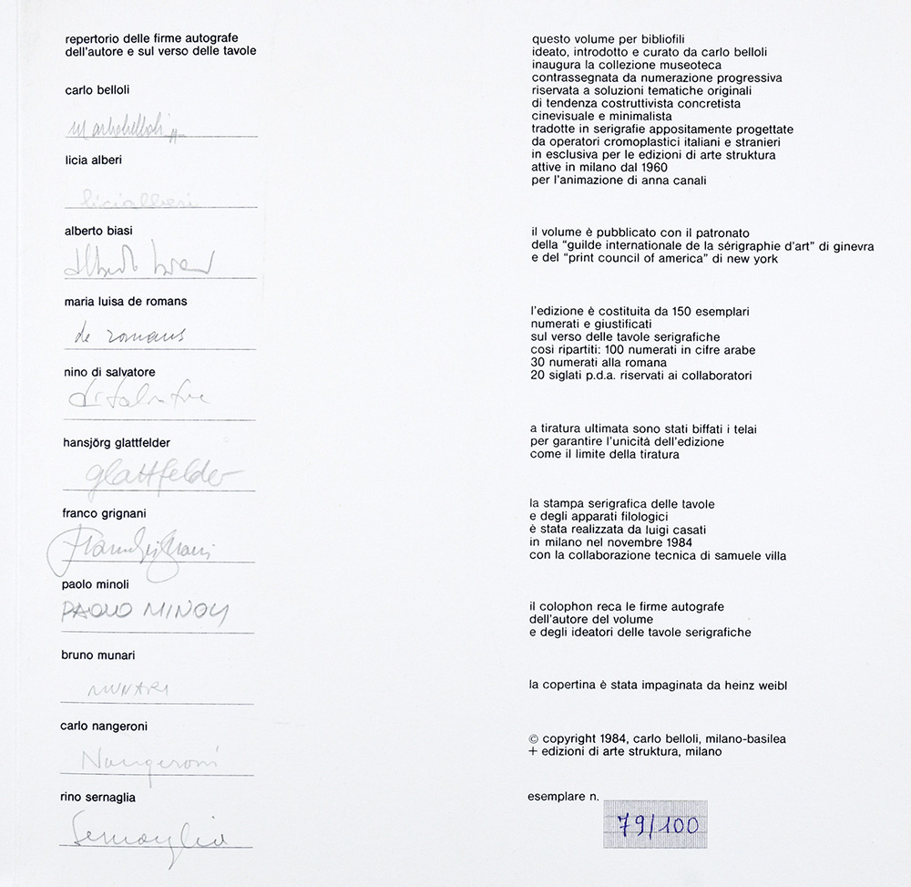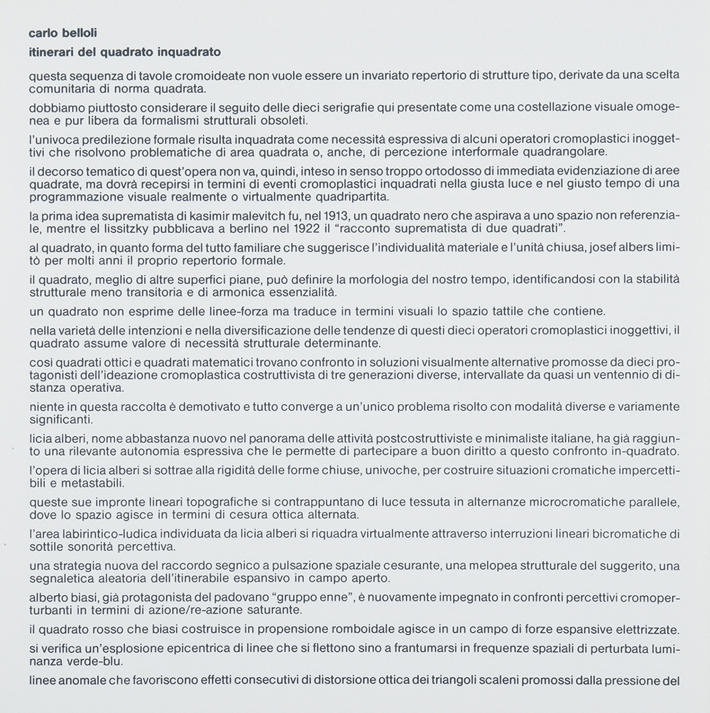 CARTELLA DI 10 SERIGRAFIE In quadrato: 30 x 30, 1984 Cartella contenente 10 serigrafie di Licia Alberi, Alberto Biasi, Maria Luisa de Romans, Nino di Salvatore, Hansjörg Glattfelder, Franco Grignani, Paolo Minoli, Bruno Munari, Carlo Nangeroni, Rino Sernaglia, cm. 30 x 30 cad. Tiratura 100 esemplari numeri arabi - 30 esemplari alla latina - 20 p.a. h.c. Edizioni Arte Struktura Milano Firmato e datato sul retro Opera n. 79/100 Prov. Collezione Privata