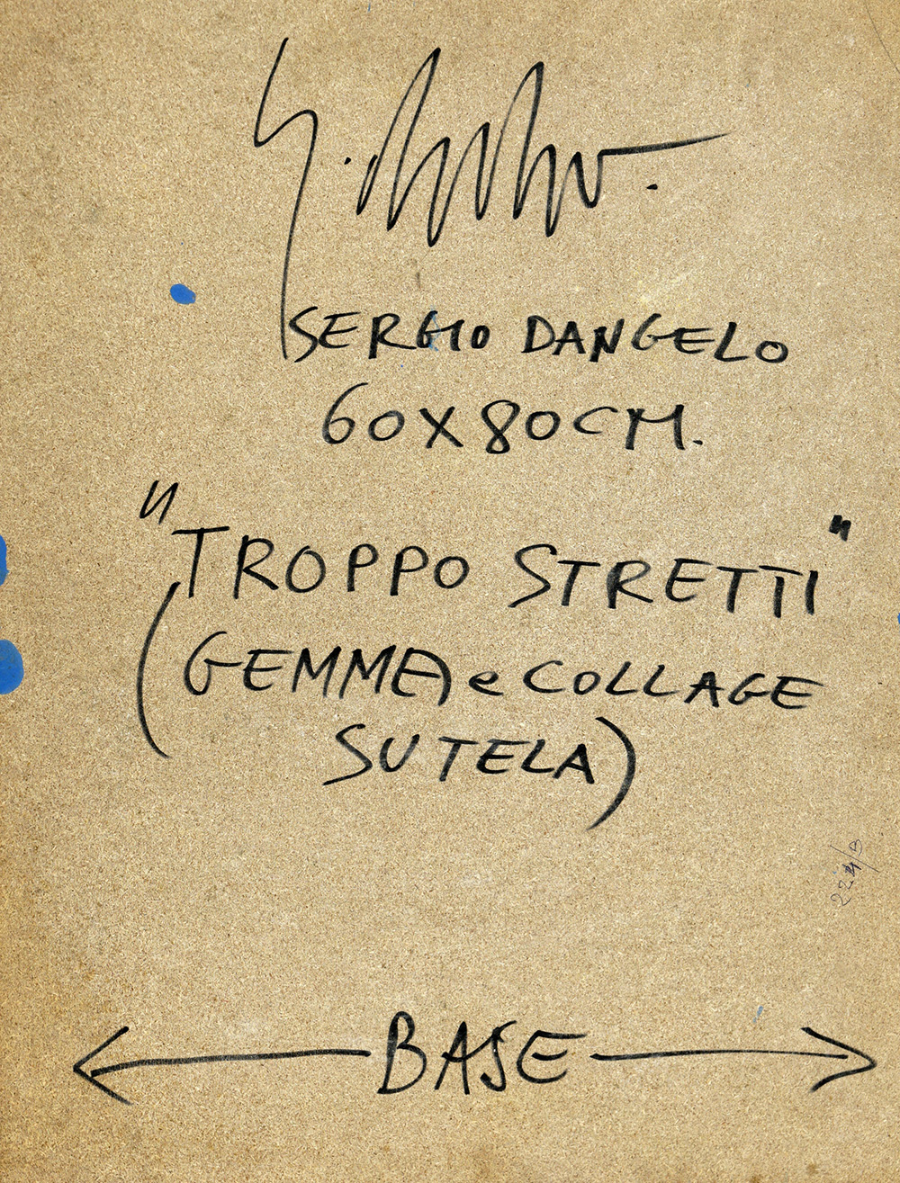 SERGIO DANGELO 1932 Troppo stretti Pittura e collage su tavola, cm. 80 x 60 x...