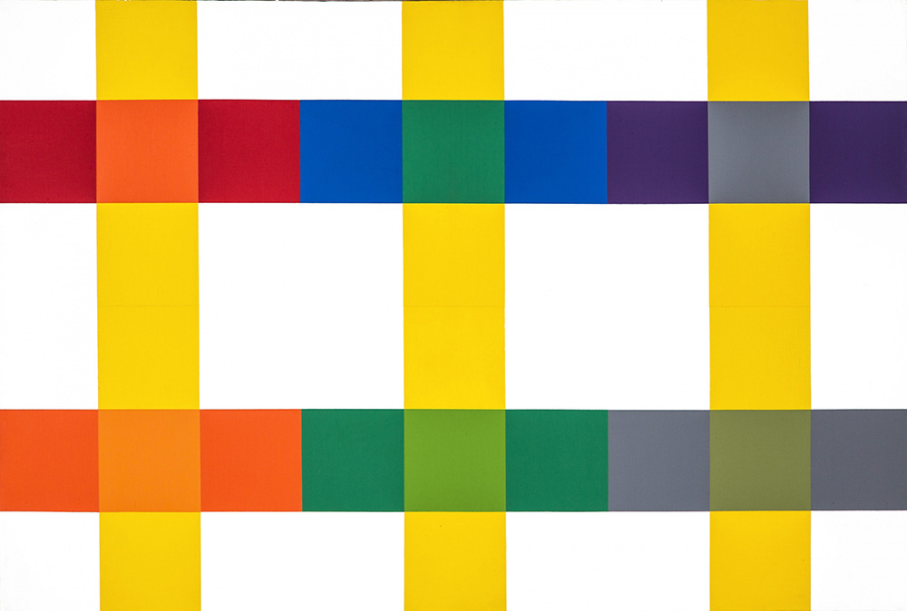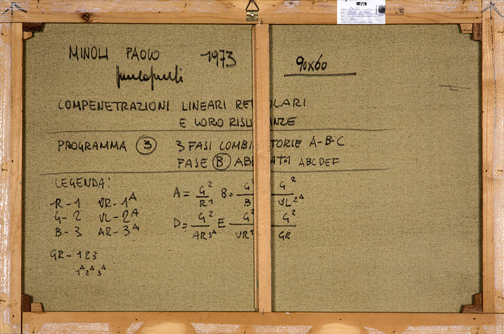 PAOLO MINOLI 1942 - 2004 Compenetrazioni lineari reticolari e loro risultanze, 1973 Acrilico su tela, cm. 60 x 90 Firmato e datato sul retro Etichetta e timbro Lagorio Arte Contemporanea, Brescia sul retro Prov. Collezione Privata
