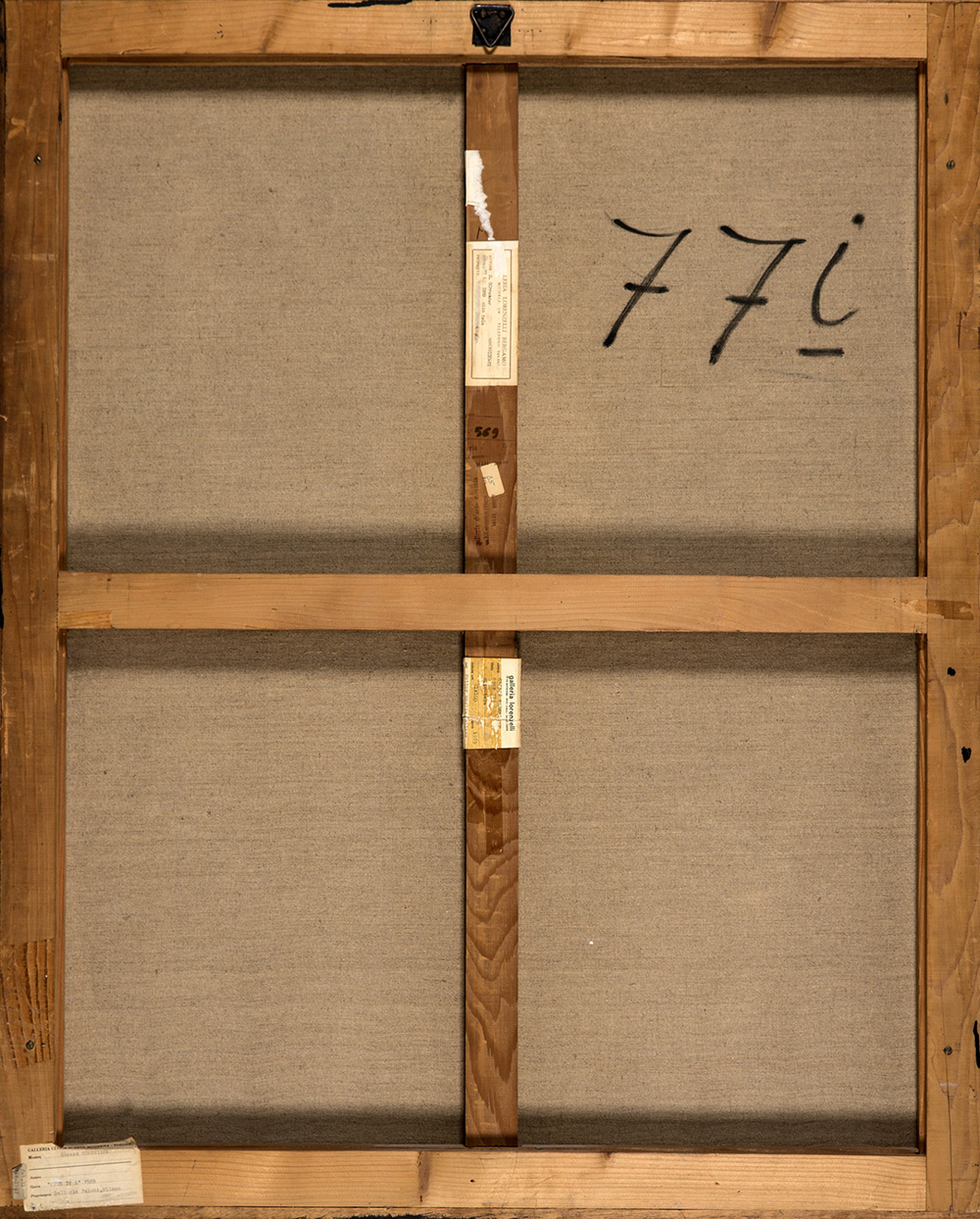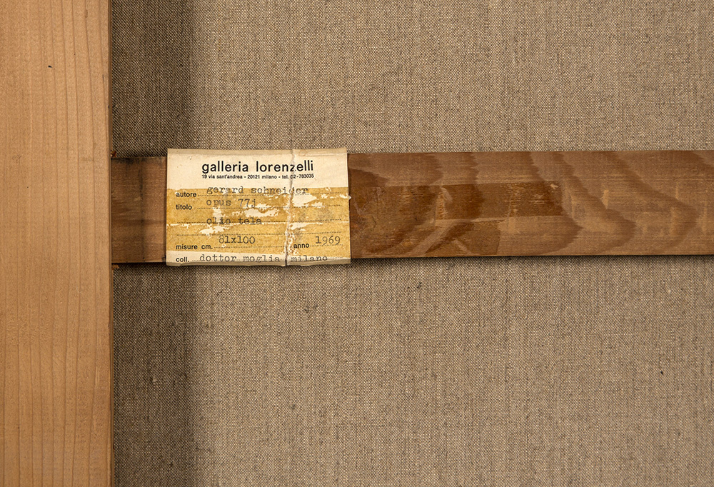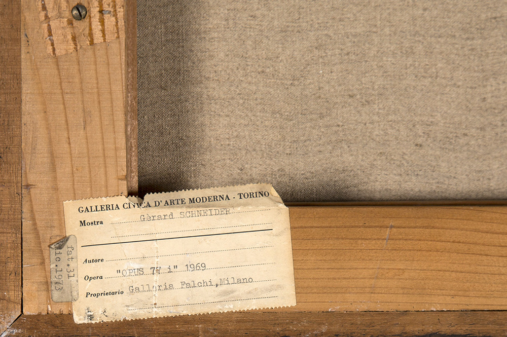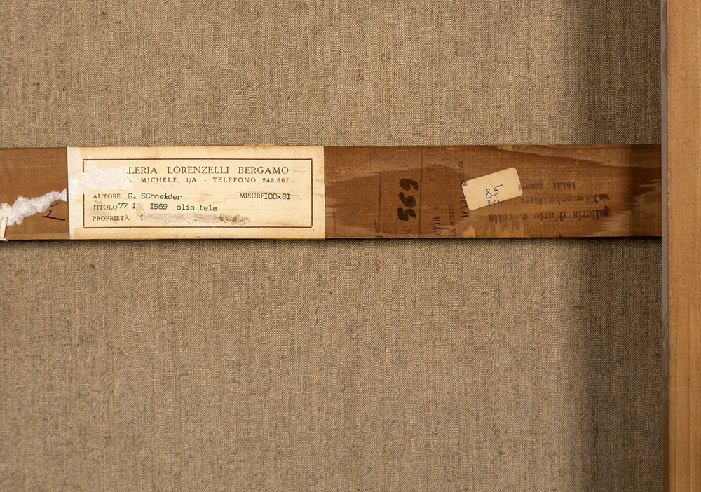 GERARD SCHNEIDER 1896 - 1986 77i, 1969 Olio su tela, cm. 100 x 80,5 Firmato e datato in basso a sinistra Etichetta Galleria Lorenzelli, Bergamo sul retro Etichetta Galleria Lorenzelli, Milano sul retro Etichetta Galleria Civica d’Arte Moderna, Torino sul retro Timbro Galleria R. Rotta, Genova sul retro Prov. Collezione Privata