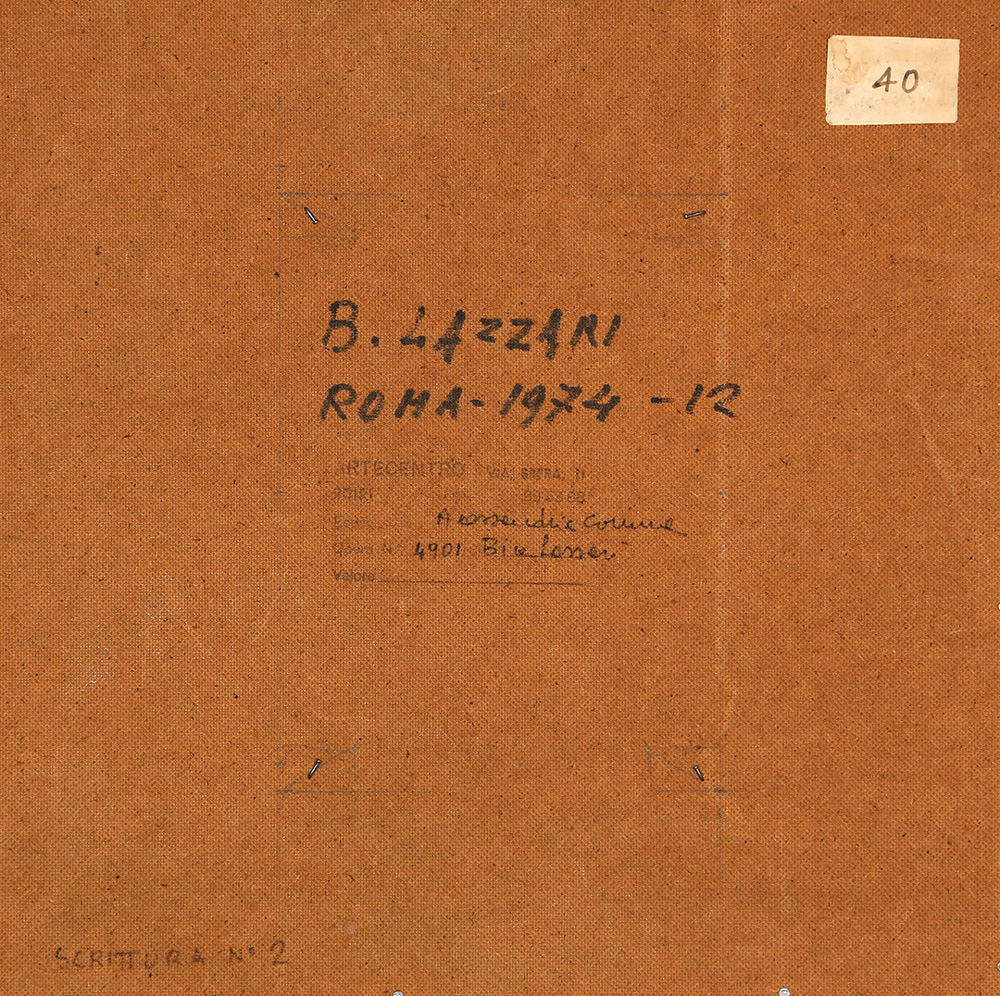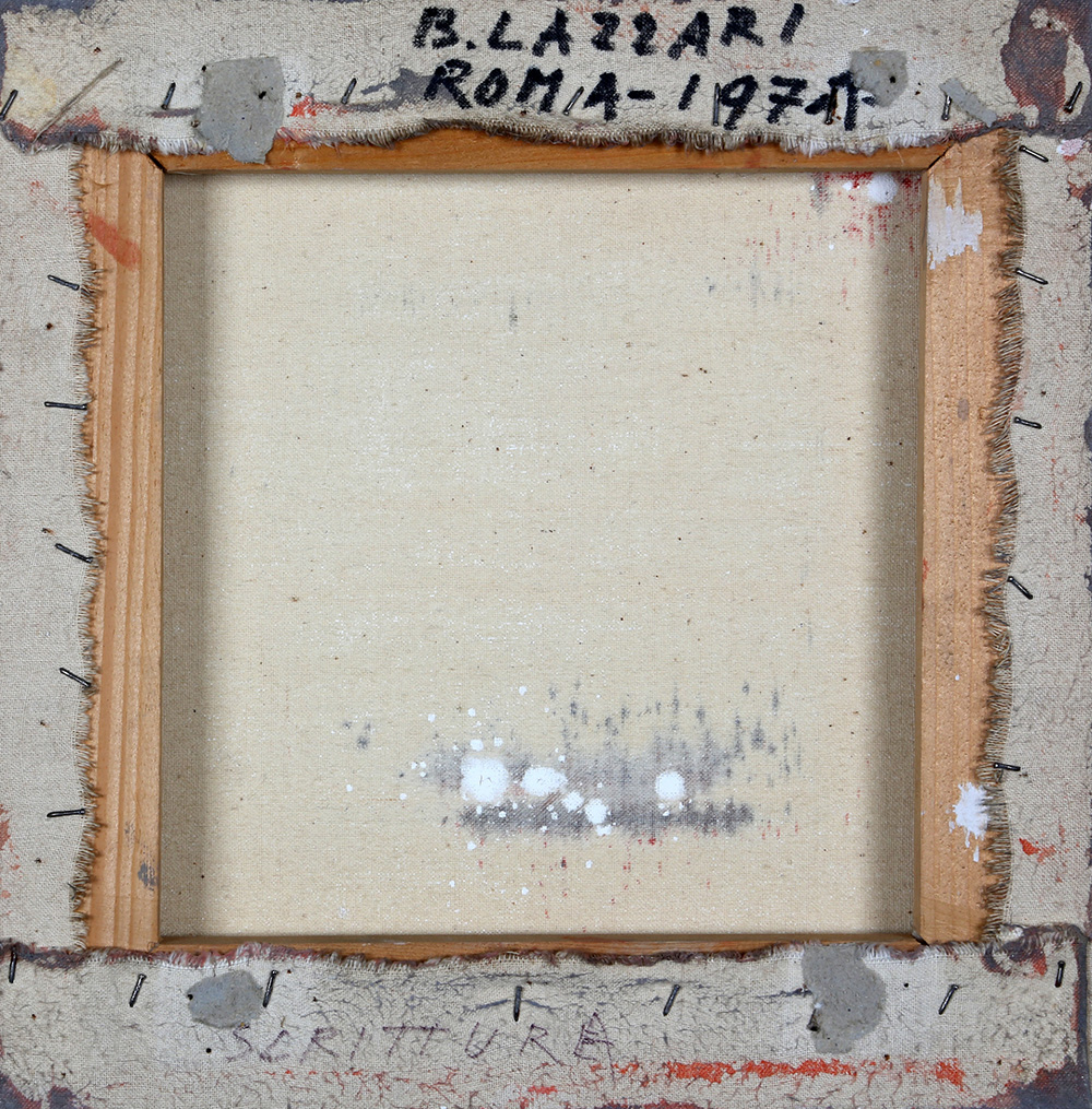BICE LAZZARI 1900 - 1981 Scrittura n.2, 1974 Tecnica mista su tela, cm. 25 x 25 Firmato e datato sul retro Timbro Arte Centro, Milano sul retro Certificato di Autenticità a cura dell’Archivio Bice Lazzari Prov. Galleria Arte Centro, Milano Prov. Collezione Privata Torino Prov. Collezione Privata