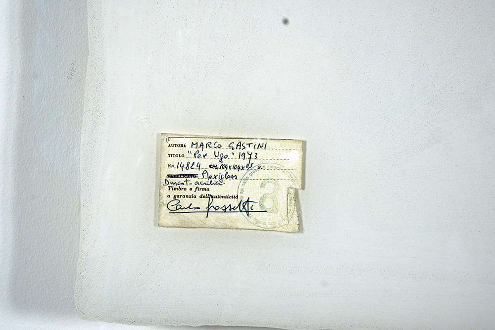 MARCO GASTINI 1938 Per Ugo, 1973 Acrilico e durcot su plexiglass, cm. 103,5 x 103,5 Firmato e datato sul retro Etichetta e timbro Grossetti Arte, Milano sul retro Prov. Collezione Carla Panicali di Montaldo, Galleria Marlborough, Roma Prov. Collezione Privata