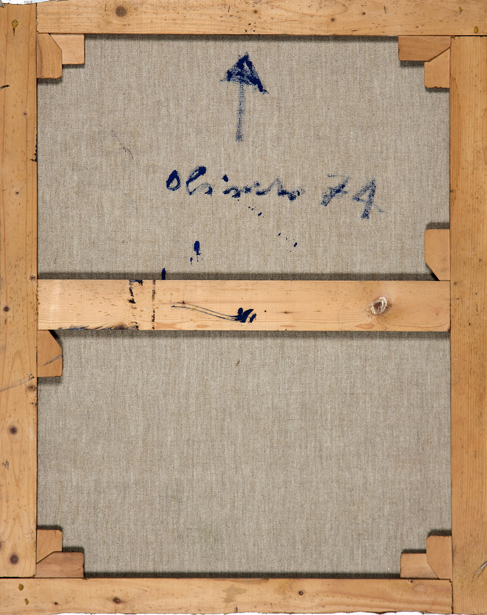 CLAUDIO OLIVIERI 1934 Senza titolo, 1974 Olio su tela, cm. 100 x 80 Firmato e datato sul retro PUBBLICAZIONI: “Omaggio a Claudio Olivieri - Opere 1971-1979 + Gilgamesh”, Galerie 21, Roma Prov. Collezione Privata