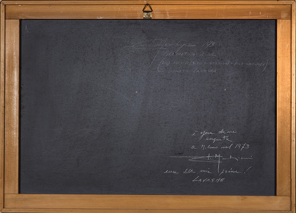 ELIO MARCHEGIANI 1929 Grammature di colore, 1973 Grammature di colore su lavagna nera, cm. 54 x 74 Firmato e datato sul retro Autentica dell’artista sul retro Prov. Collezione Privata
