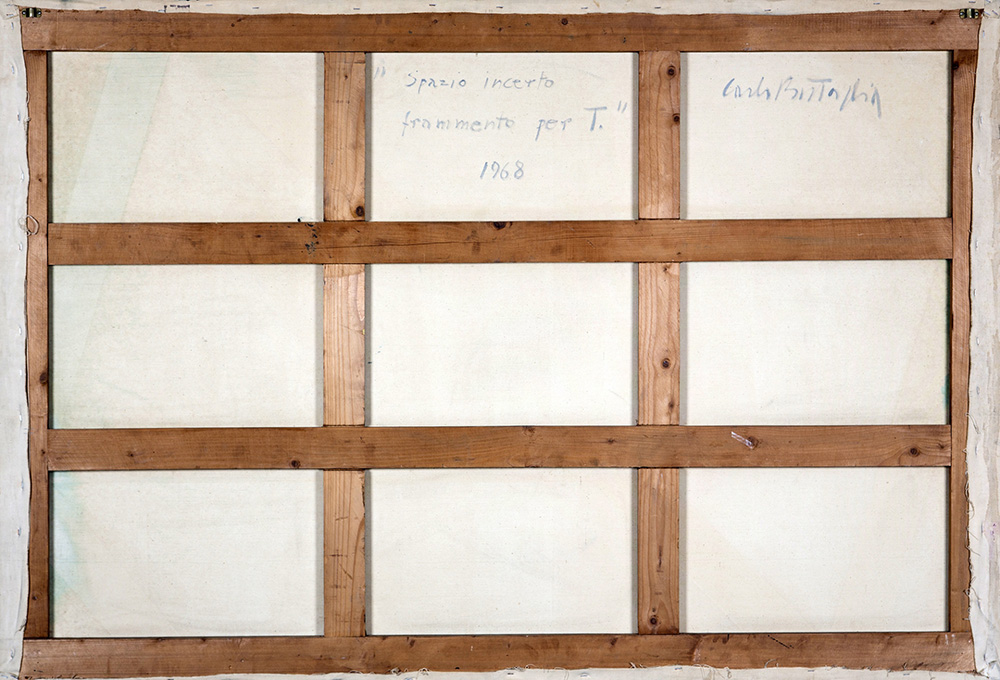 CARLO BATTAGLIA 1933 - 2005 Spazio incerto frammento per T., 1968 Olio su tela, cm. 130 x 190 Firmato e datato sul retro Prov. Collezione Privata