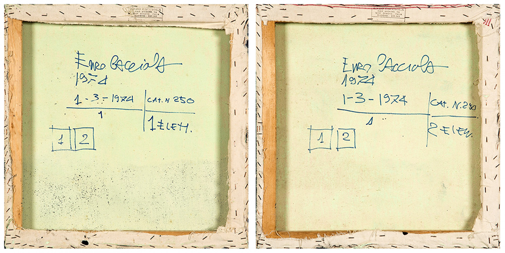 ENZO CACCIOLA 1945 1-3-1974, 1974 Dittico, olio su tela, cm. 50 x 100 (cm. 50 x 50 cad.) Firmato e datato sul retro Timbro dell’artista sul retro Autentica dell’artista su fotografia Prov. Collezione Privata