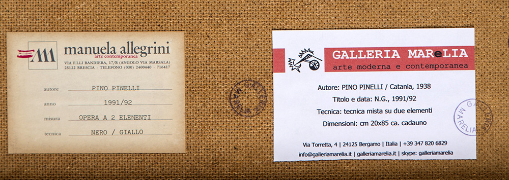 PINO PINELLI 1938 Pittura N.G., 1991-92 Tecnica mista su due elementi, cm. 40 x 85 (cm. 20 x 85 cad.) Firmato e datato sul retro Etichetta e timbro Galleria Marelia, Bergamo sul retro Etichetta Manuela Allegrini , Brescia sul retro Certificato di Provenienza a cura della Galleria Marelia, Bergamo Autentica dell’artista su fotografia ESPOSIZIONI: “Yellow! Variazioni in Giallo”, Galleria Marelia, Bergamo, maggio - giugno 2009 Prov. Galleria Marelia, Bergamo Prov. Collezione Privata