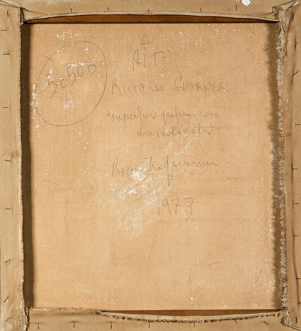 RICCARDO GUARNERI 1933 Superficie grafica con due inclinate, 1973 Tecnica mista su tela, cm. 59,5 x 54,5 Firmato e datato sul retro Autentica dell’artista su fotografia Prov. Collezione Privata