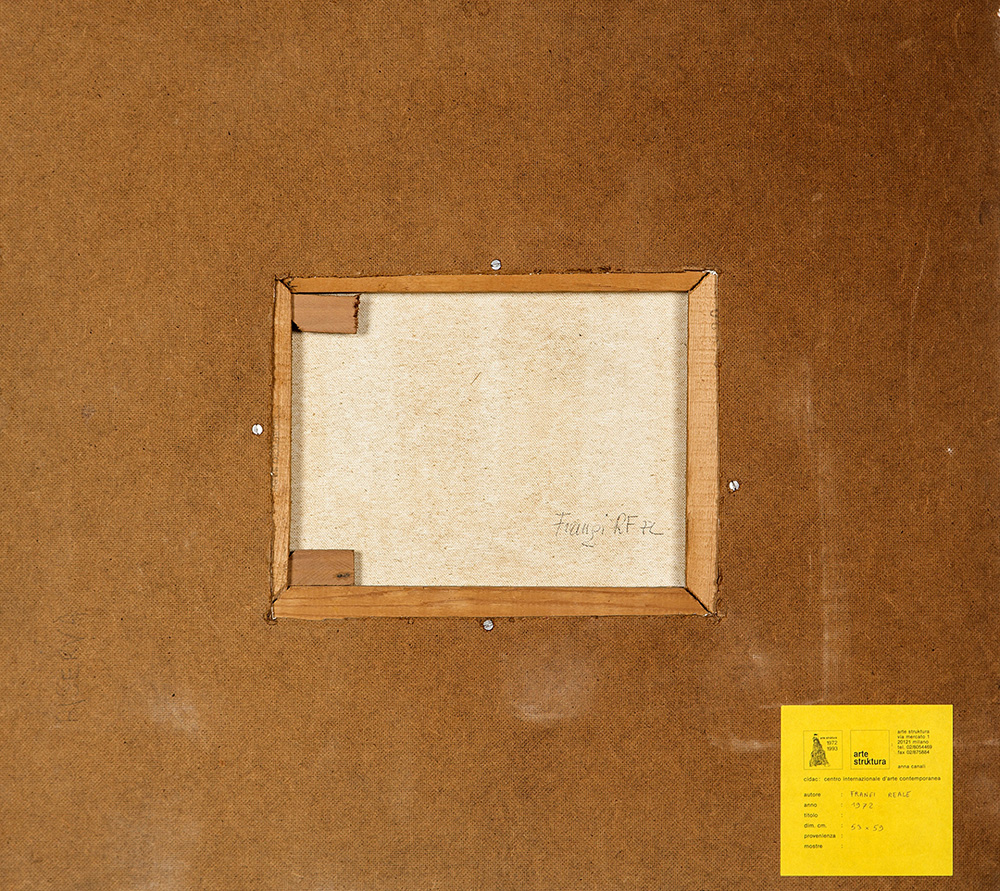 REALE FRANCO FRANGI 1933 Senza titolo, 1972 Collage di cartoni su tela, cm. 38 x 30 Firmato e datato sul retro Etichetta Arte Struktura, Milano sul retro Prov. Collezione Privata