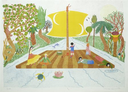 Monica Marinello La Zattera, 1978 Litografia a colori, mm. 500x700; es. 81/99 Firma in basso a destra, tiratura in basso a destra. Stampatore: Il Bisonte, Firenze. € 100/150