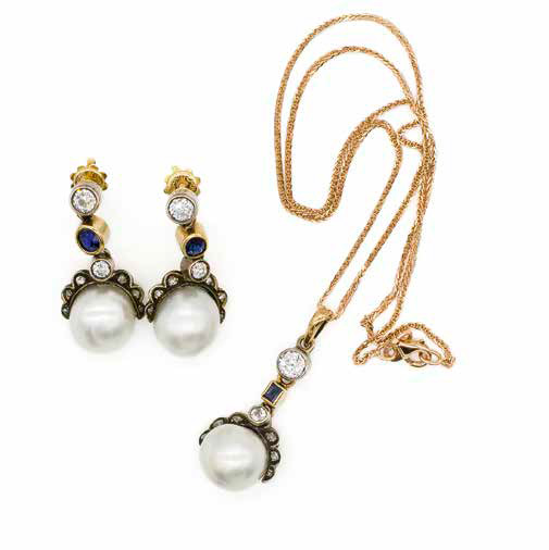 Parure composta da pendente con catenina in oro rosa e diamanti, zaffiro e perla, gr. 7,9, e orecchini in oro bianco e giallo con diamanti, zaffiri e perle, gr. 12,1.