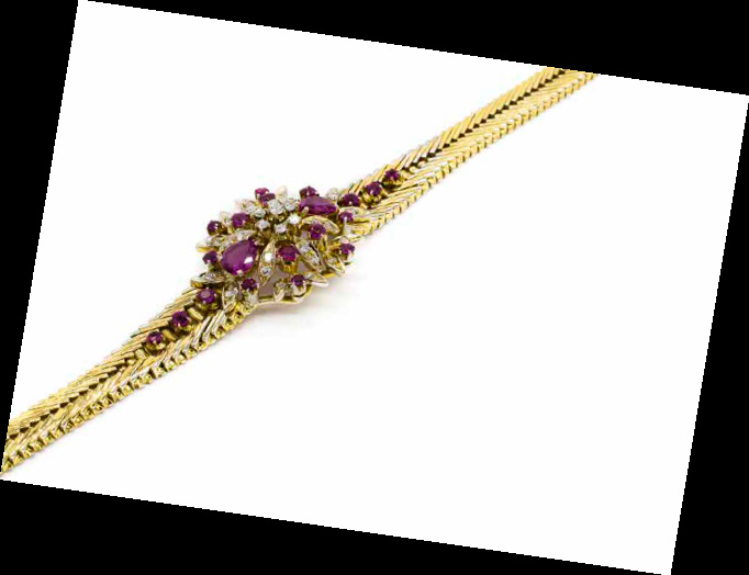 Bracciale in oro giallo, gr. 25,9, con diamanti e rubini.
