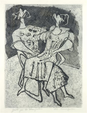 Luciano Minguzzi (Bologna, 1911 - 2004) Figure Acquaforte, mm. 400x300 (foglio); mm. 325x240 (lastra) Firma in basso a destra, tiratura in basso a sinistra. € 100/200