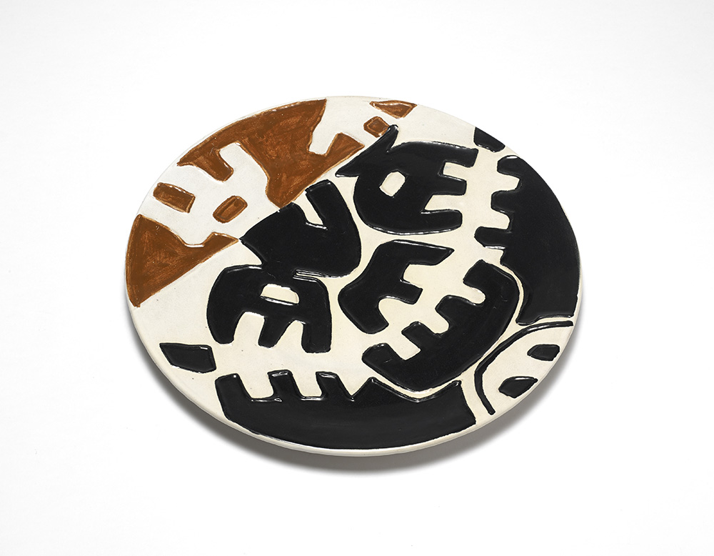 Ceramic plate with black abstract motifs and ocher underglazed. Manufacture of M.G.A. Albisola, 1957. Cavallino edition. Registered and numbered n° 15 at verso. (d 40.5 cm.) (slight defects)