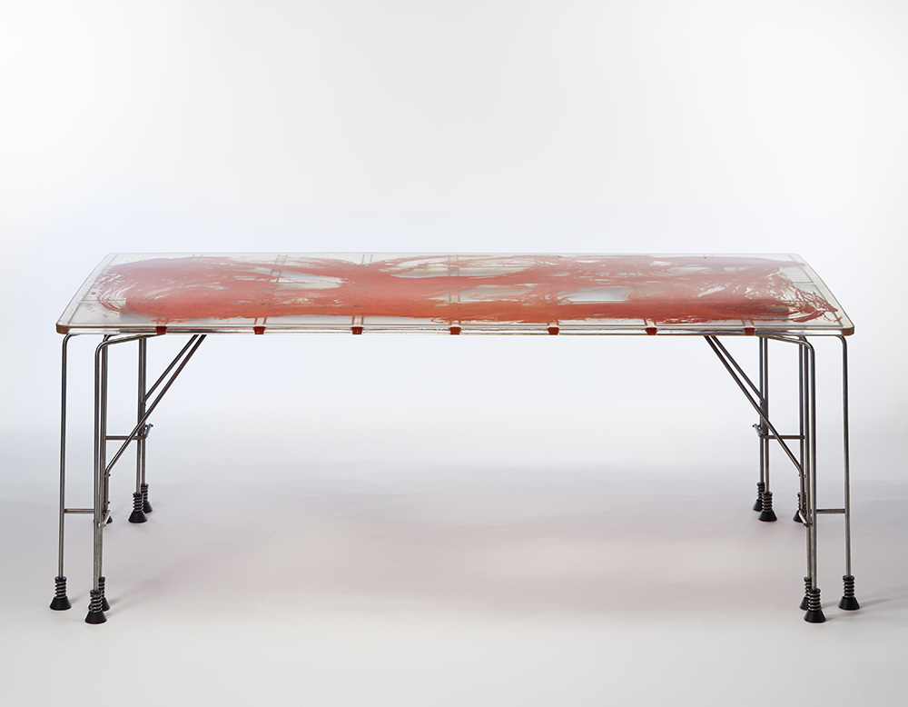 Tavolo modello "931 Broadway". Produzione Bernini, Italia, 1993. Struttura in acciaio inox con dodici gambe e piedini a molla e piano in resina epossidica incolore e arancione. (cm 197,5x74x99)