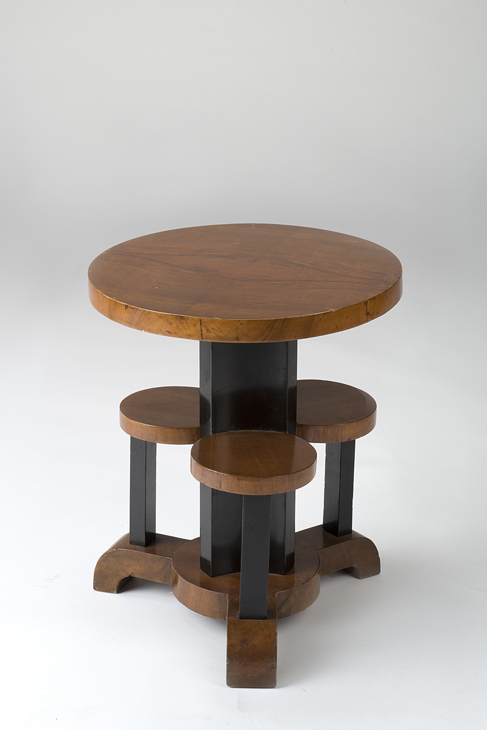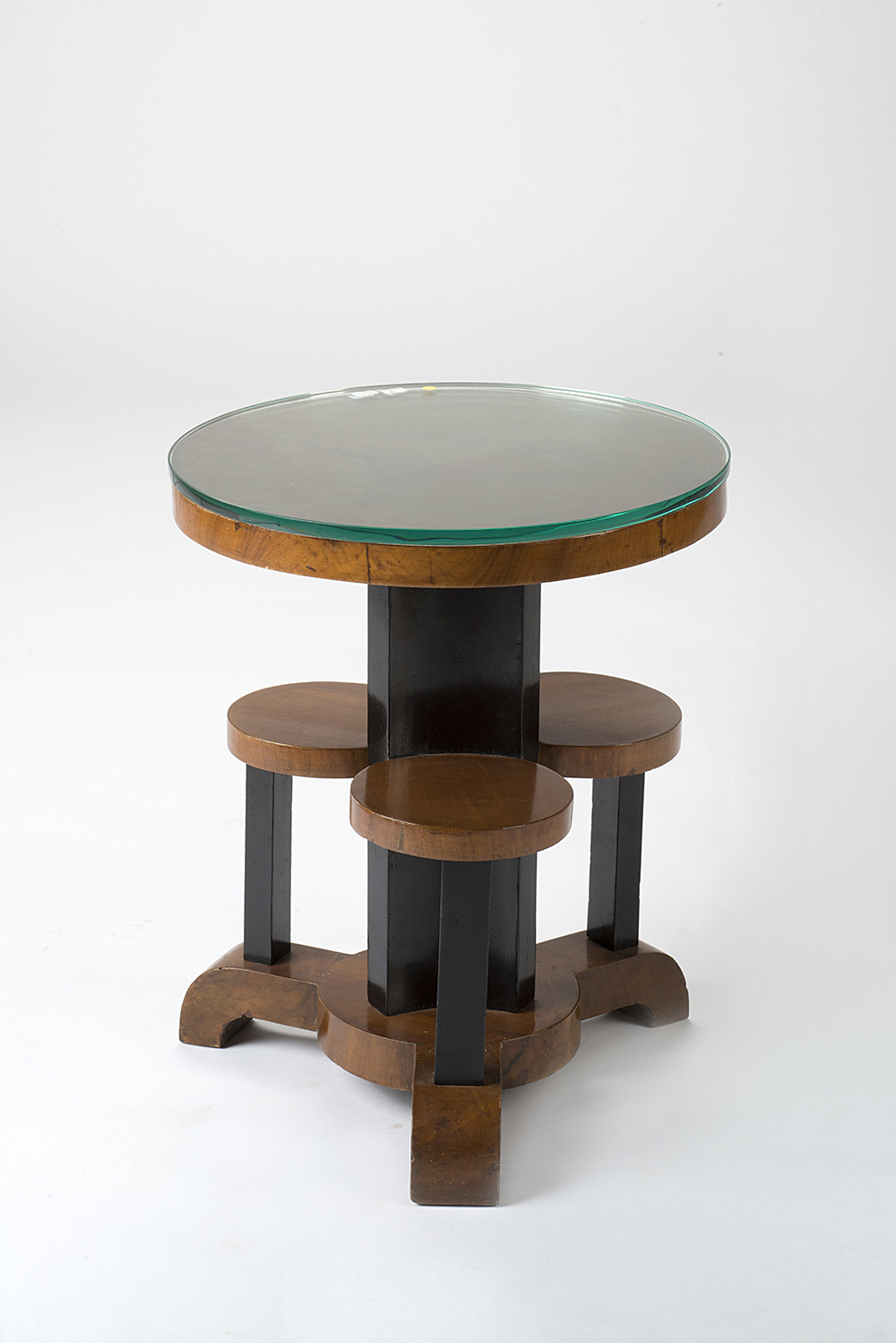 Piccolo piedistallo di gusto déco con piano principale e tre ripiani minori circolari. Struttura in legno impiallacciato ed ebanizzato e sovrapiano in vetro. Anni '30. (h cm 42; d cm 35) (difetti e restauri)