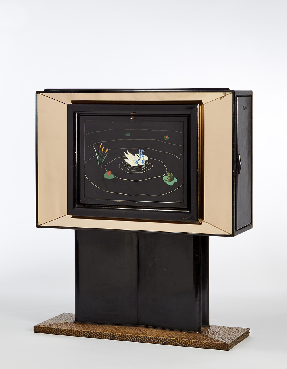 Ebonized bar-cabinet with pink-amber crystal mirrors and wood basement with bacellatura; central front-fall cupboard painted by Gigi Del Giudice and representing swans and frog in a pond. Interior covered by pink-amber mirrors. Lateral parts with glass shelves. Veneered top compartment. Italy, 1930s. (120x142x40 cm.) (defects and losses)