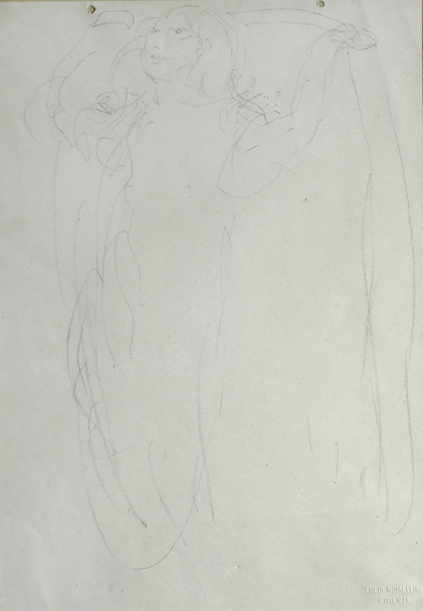Plinio Nomellini (Livorno, 1866 - Firenze, 1943) Figura di donna con mantello Matita su carta, cm. 35,5x25 Timbro a secco: Eredi Nomellini Firenze. € 250/350