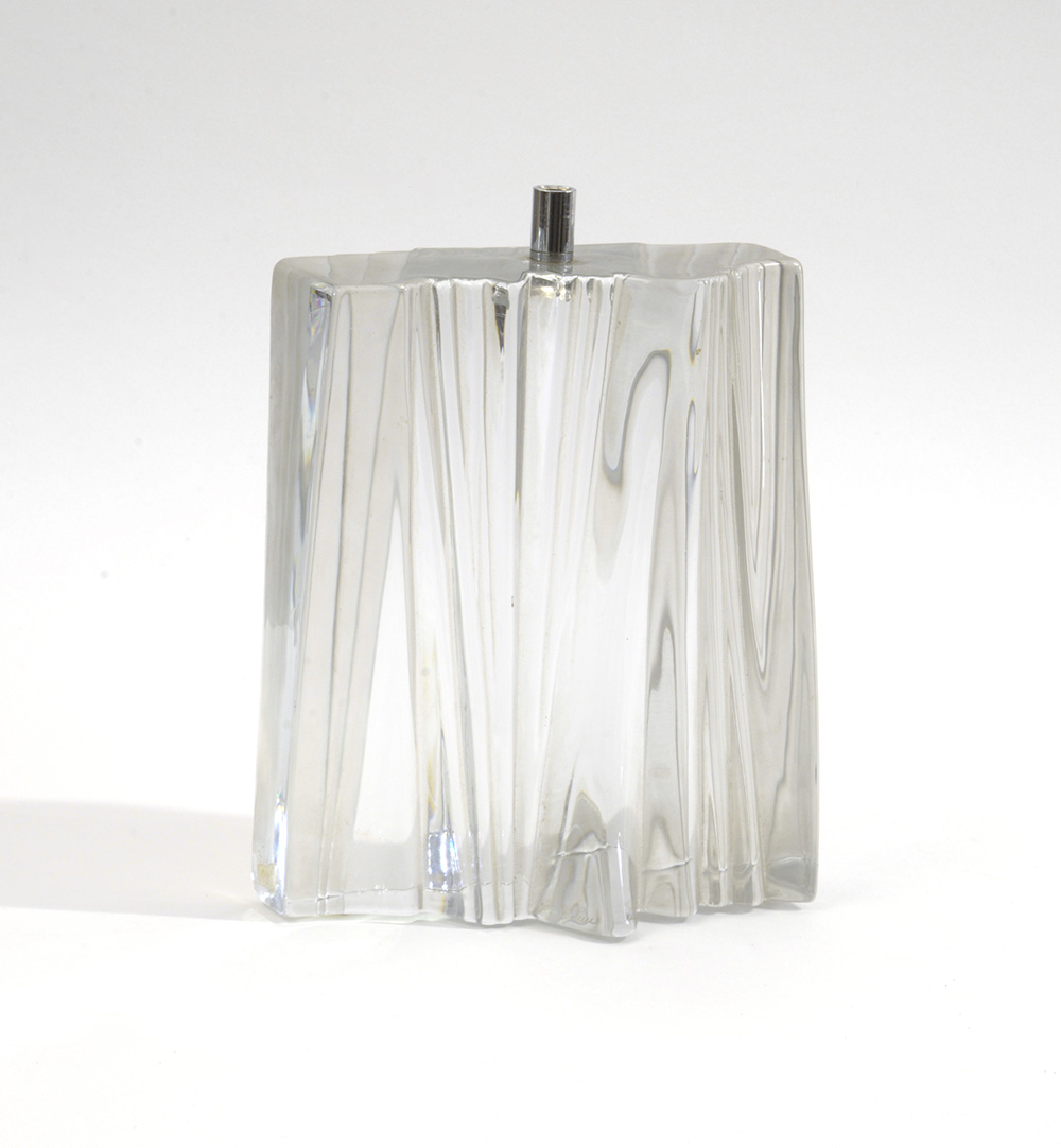 Lamp basement in colorless solid glass acidato on the internal surface. Nancy, France, 1970s. (17.5x21x9 cm.) (defects)