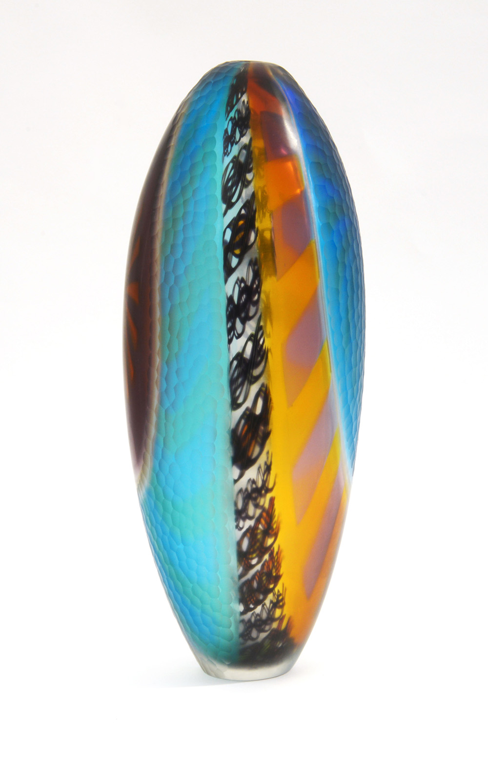 Grande vaso in vetro soffiato policromo e a murrine nei colori azzurro, arancione e ametista, battuto sulla superficie esterna. Murano, seconda metà secolo XX. Firmato a punta "A. Zilio Murano" e numerato 1/1. (h cm 48)