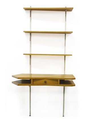 Scrivania-libreria a parete in metallo verniciato bianco e legno chiaro impiallacciato. Italia, anni '60. (cm 62,5x201x110) (lievi difetti)