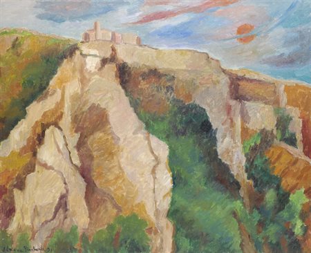 Adriana Pincherle (Roma, 1906 - Firenze, 1996) Volterra, 1991 Olio su tela, cm. 65x80 Firmato e datato in basso a sinistra: "Adriana Pincherle 91". Sul verso: firma, data e titolo. € 800/1.200