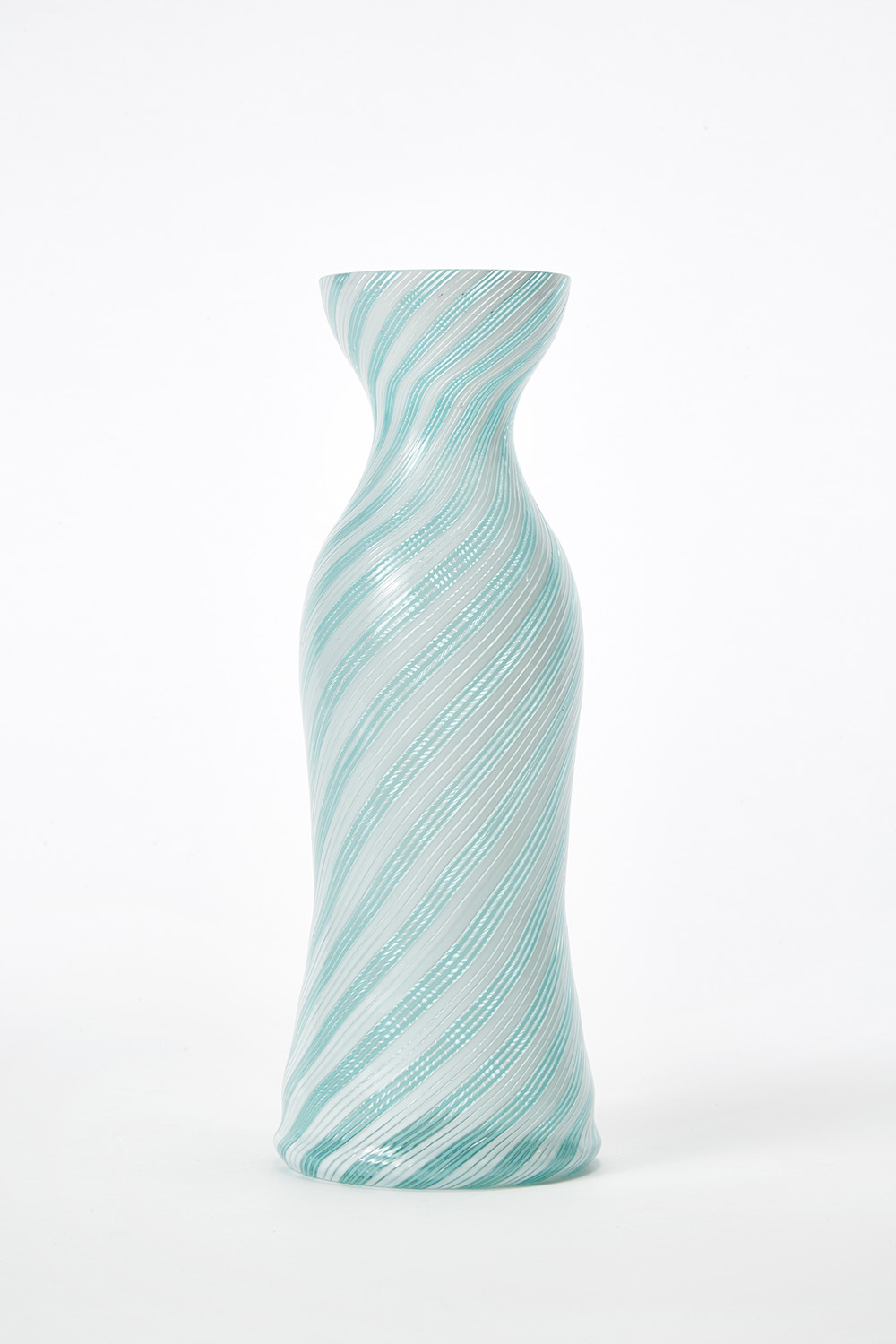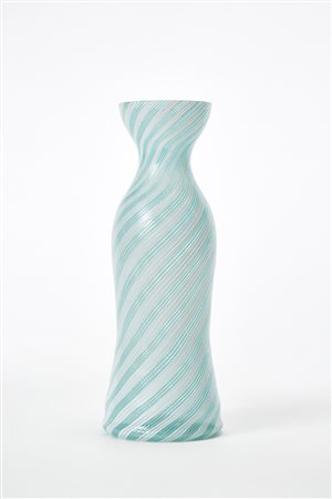 Vaso modello "6049". Esecuzione Vetreria Aureliano Toso, Murano, 1954ca. Vetro soffiato a mezza filigrana incolore, verde acqua e lattimo. (h cm 39)