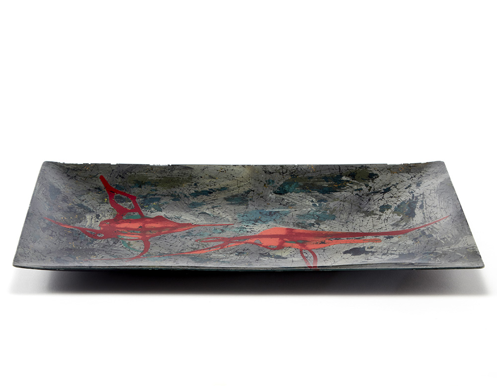 Back-painted glass tray with polychrome abstract subject. Execution by Fontana Arte, Milan, 1959. Dated on recto. (47x32.5 cm.) (slight defects)