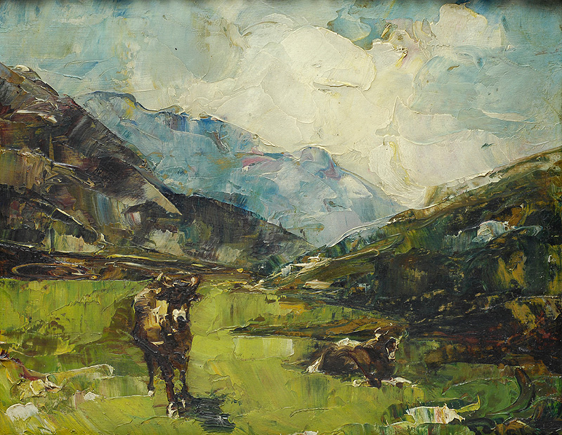 Mario Pobbiati (Milano, 1857 - Milano, 1956) Pascolo in montagna Olio su tavola, cm. 20x26 Firma in basso a destra. € 280/380