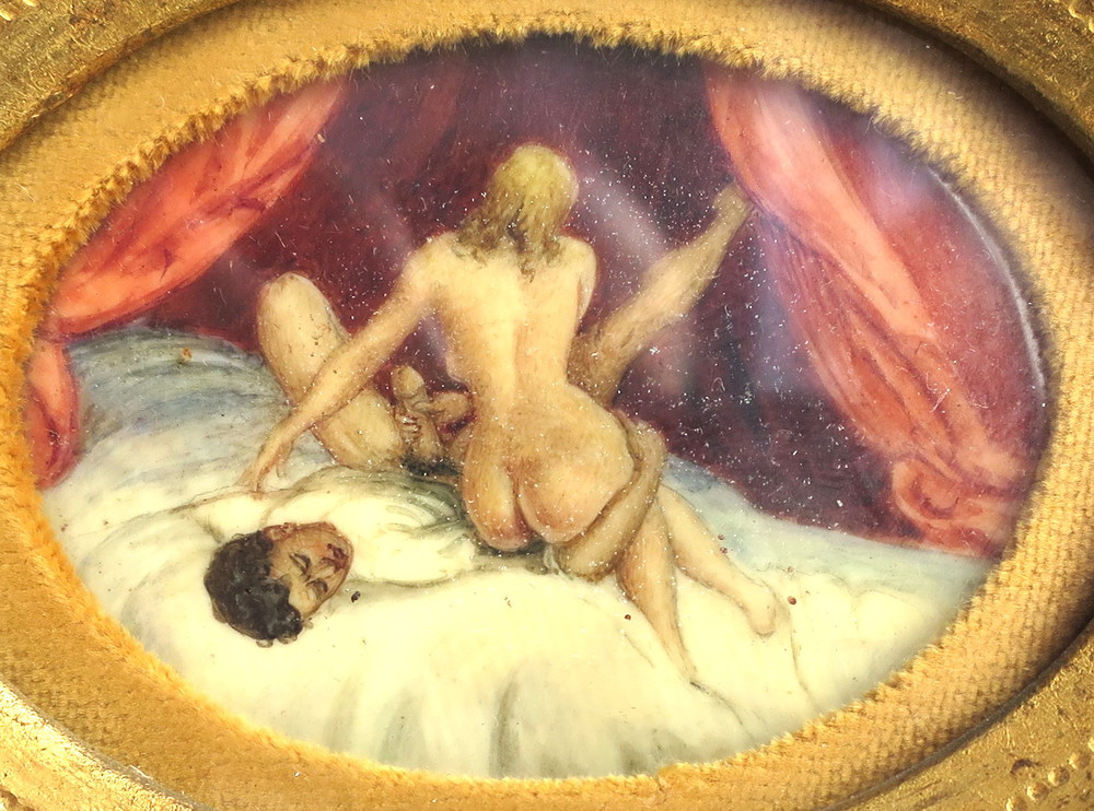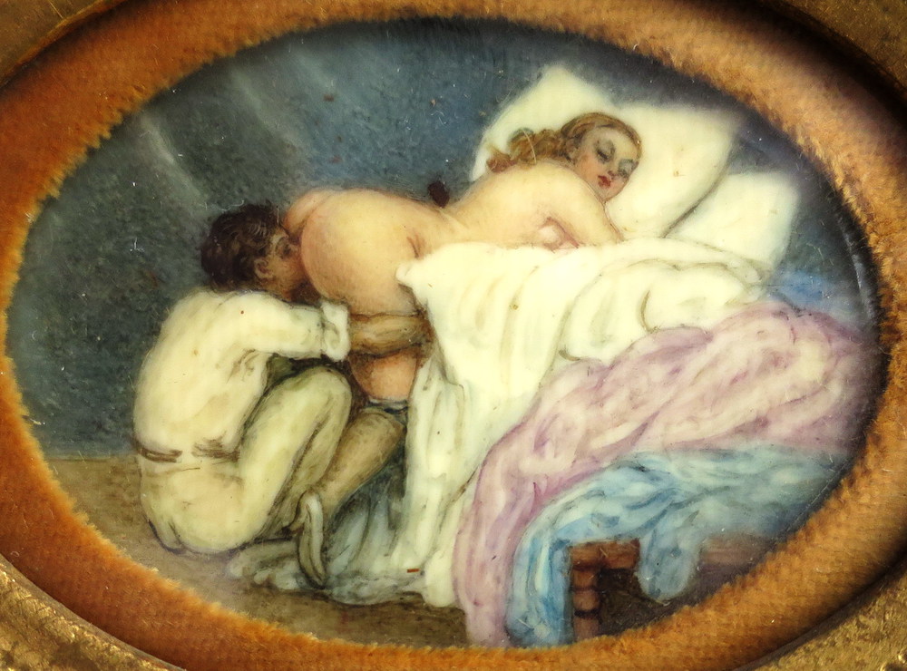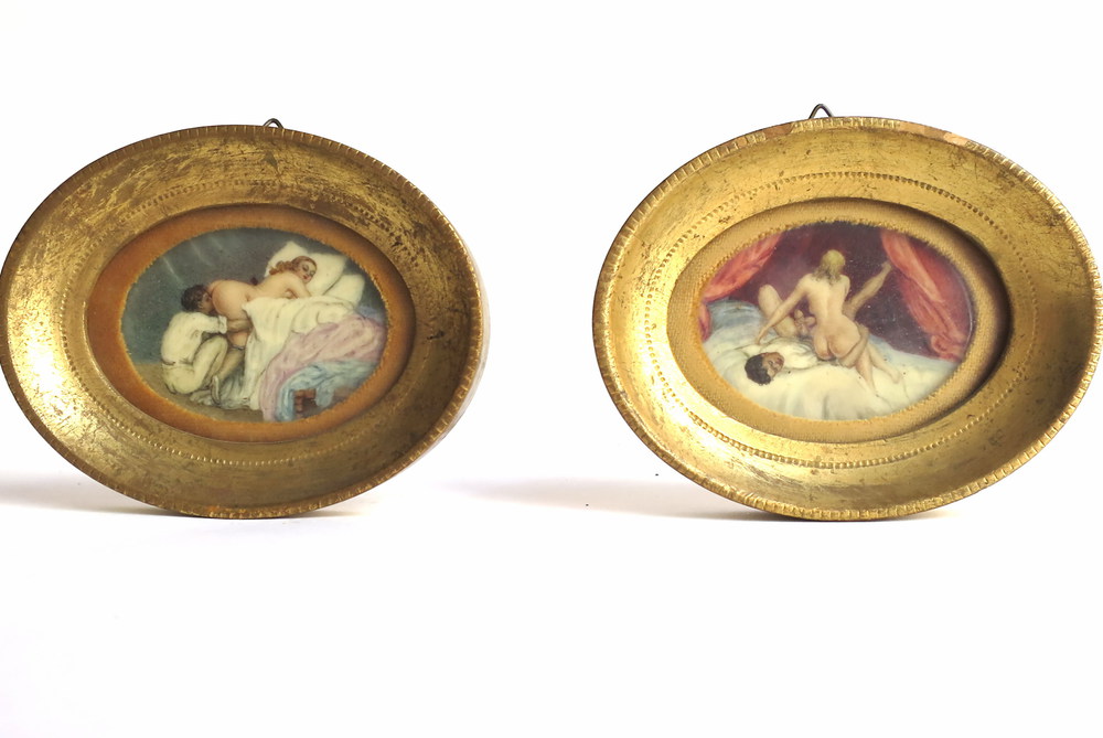 MINIATURE Coppia - Ovale "Scena erotica" - cm 6 x 4.3 - sec XIX - Francia